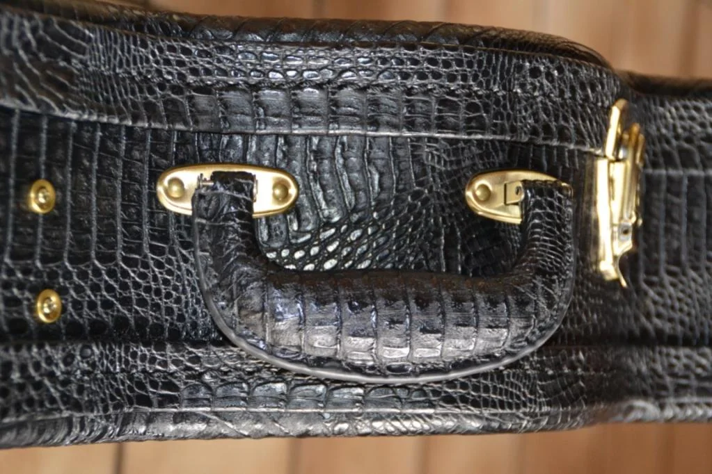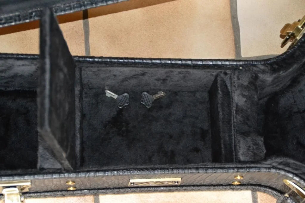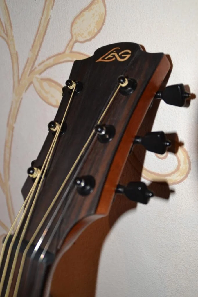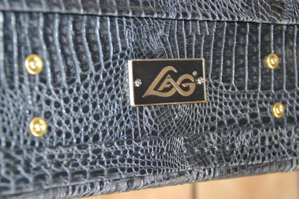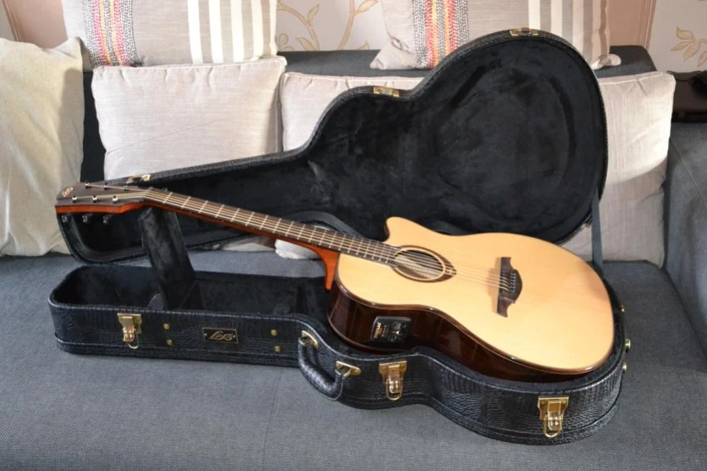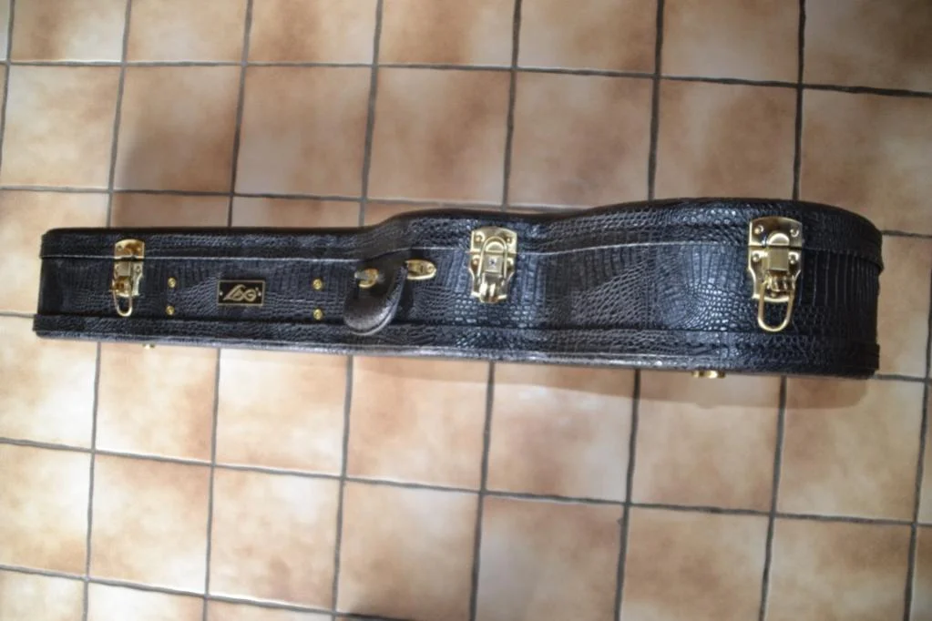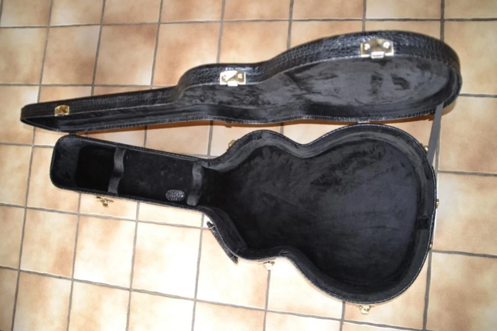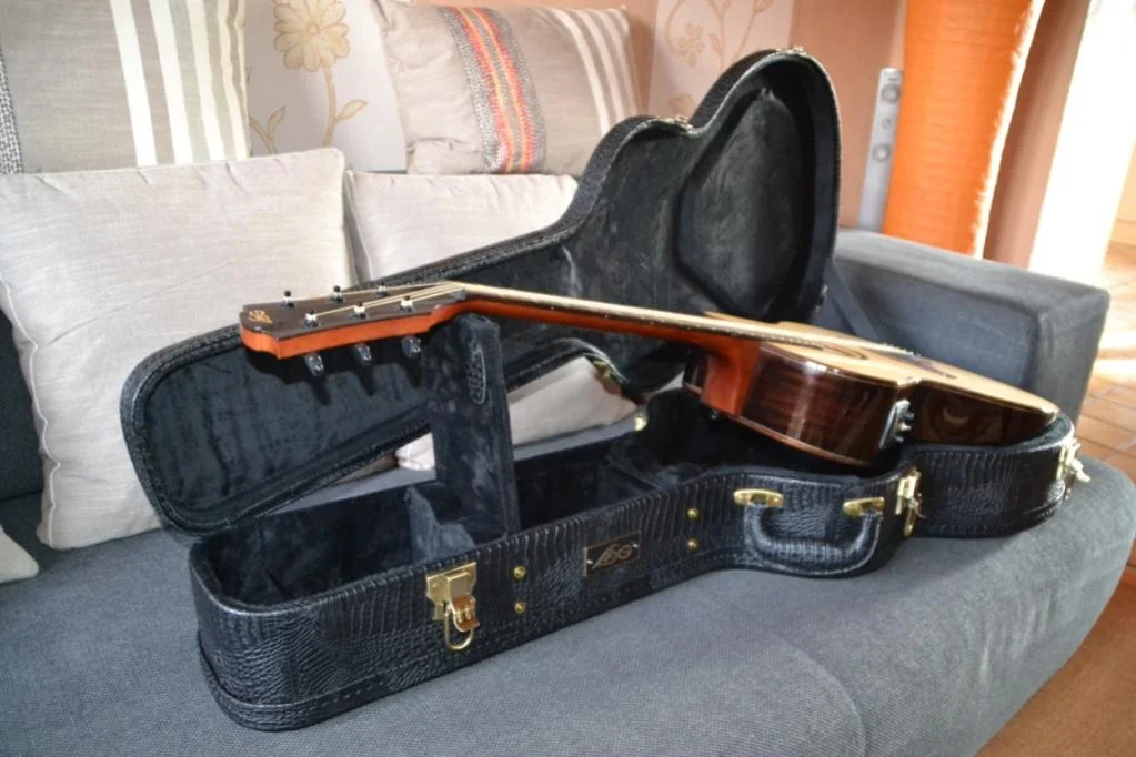 Speziell zur LAG gibts noch einen wunderschönen schwarzen grobgemaserten Krokooptikkoffer in absoluter Top Verarbeitung. Innen schwarzes Samt in das die Gitarre haargenau hineinpasst, da wackelt nichts. Ein Fach für Saiten, Plek und Kapo gibts auch. Fünffachverriegelung mit abschliessbarem Schloß ist selbstverständlich. Einziger Nachteil, der Koffer ist kein Leichtgewicht.