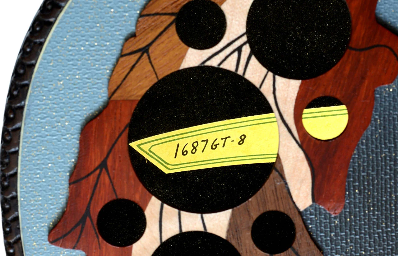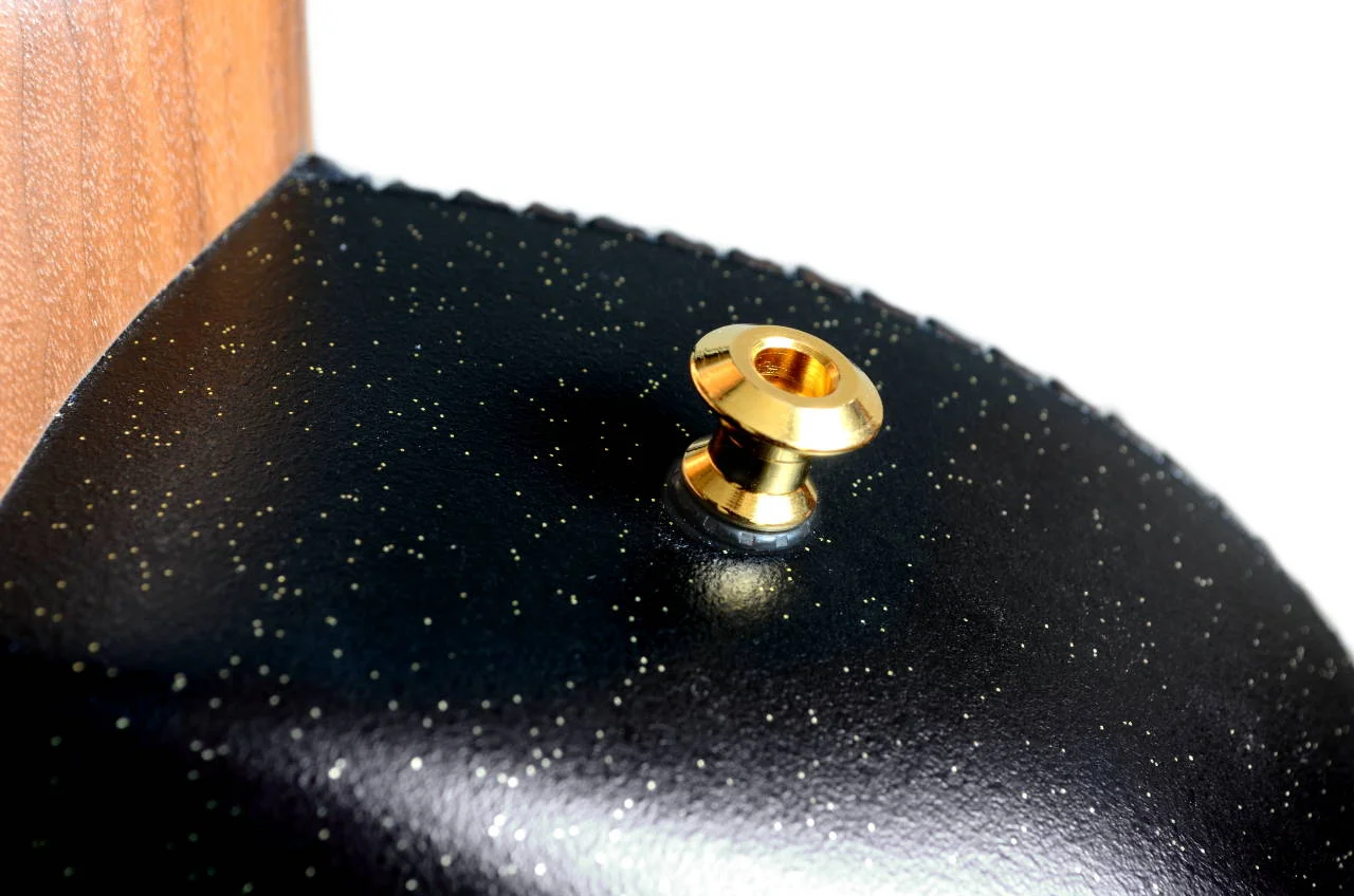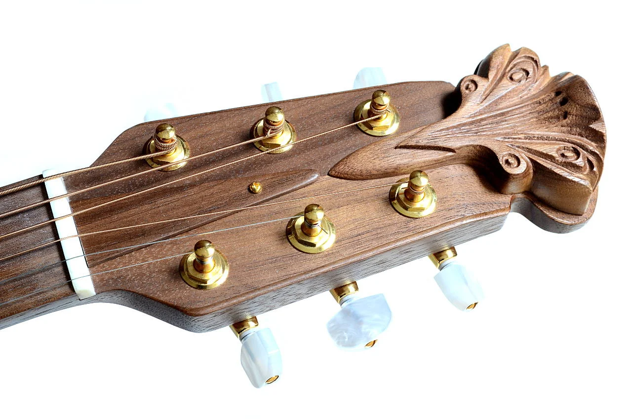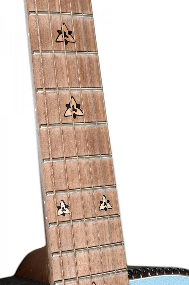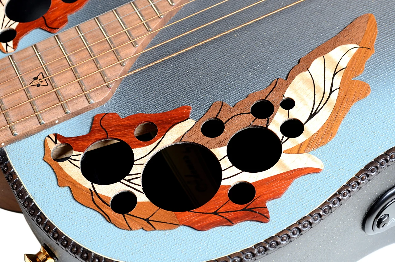 Neben der auffälligen und in der Gitarrenwelt nicht so weit verbreiteten Blueburst-Lackierung, die einen interessanten Kontrast zu den Hölzern der Schallloch-Epauletten in warmen Brauntönen bildet, ist auch das dreidimensionale Deckenbinding ein besonderes Detail. Ebenso haben die Designer daran gedacht, den Gurtpin-Unterlegscheiben ein Design zu geben, das das Thema des Binding wiederaufnimmt. Die Griffbrett-Inlays sind klassisch im geometrisch-floralen Design ausgeführt. Da ab einer gewissen Preisklasse der Geschmack zunehmend egal wird, finden sich auf der Decke und dem Korpus goldfarbene Glitzerpartikel. Muss man mögen, fällt aber aus ein paar Schritten Entfernung nicht mehr auf. Im Korpus findet sich ein handbeschrifteter Zettel, der Modell, Seriennummer und das obligatorische "Made in U.S.A." trägt.