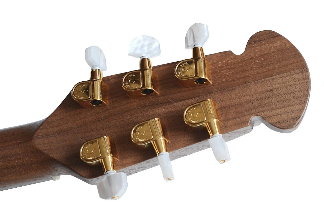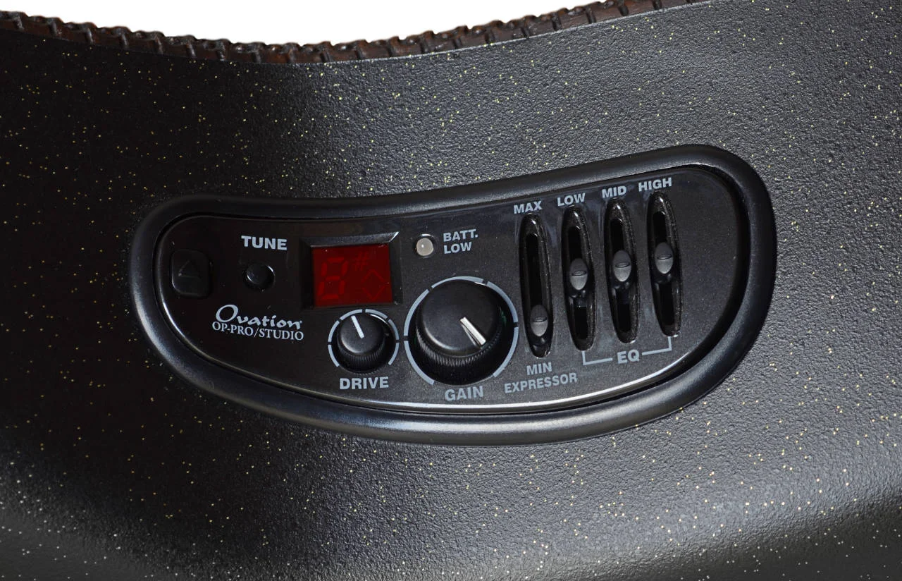 Was bei diesem Modell hinzukommt, ist der Non-Cutaway-Korpus, der als Deep-Bowl-Variante ein großes Luftvolumen in Schwingung versetzt. Der Hals mit seinem leichten V-Profil besteht bei meinem Modell aus zwei längsverleimten Stücken Walnuss, auf die ein Griffbrett (ebenfalls aus Walnuss) geleimt ist. Die charakteristische Schnitzerei auf der Kopfplatte ist nochmal separat aufgeleimt und wird umrahmt von Schaller M6-Mechaniken. Der 42mm breite Knochensattel ist einwandfrei bearbeitet und stellt von der E- zur e-Saite einen Abstand von 35mm ein. Ab Werk sind Adamas 1818-Saiten (12-53) aufgezogen, die sich aufgrund der bereits gut eingestellten Saitenlage ohne Kraftaufwand spielen lassen. Bei der Ausstattung hätte Ovation etwas großzügiger sein dürfen, es fehlt der in den Spezifikationen aufgeführte XLR-Anschluss. Ist zwar kein Weltuntergang, soll manchem aber wichtig sein. Als Preamp ist der OP-PRO Studio verbaut und bringt einige Funktionen mit: Gain- und Drive-Regler, einen “Expressor”-Schieber, sowie einen 3-Band-Equalizer.
