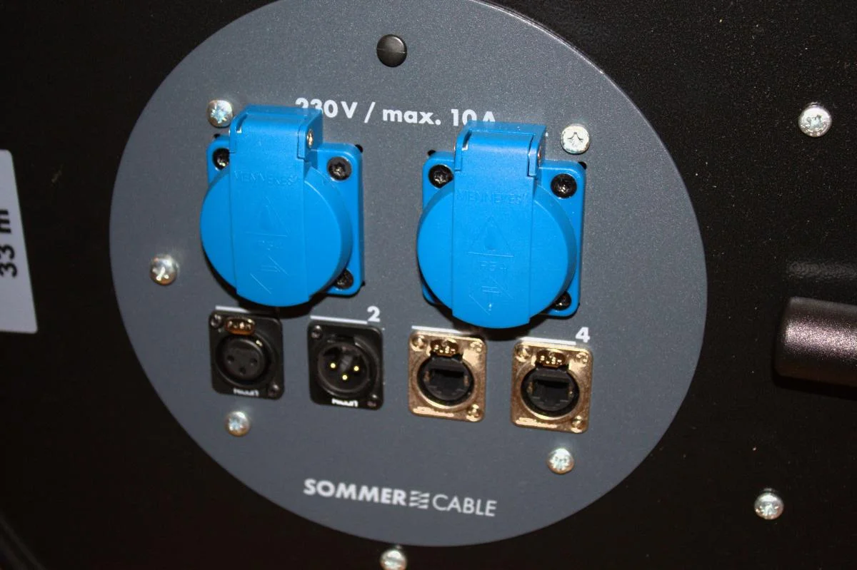 Am trommelseitigen Anschlussfeld sind 2 Schuko-Steckdosen, 2 Ethercon Buchsen und 2 XLR Buchsen verbaut.