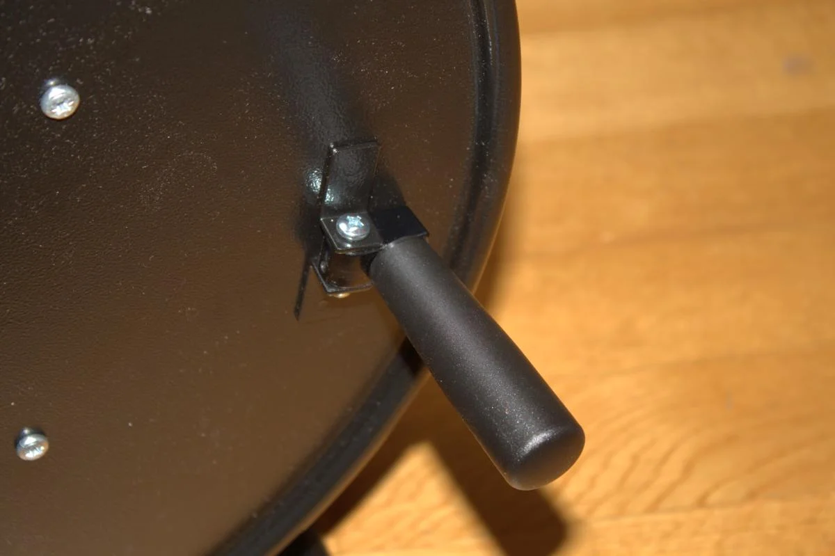 Der Grundkörper ist eine Schill Trommel, Typ HT481. Die Trommel hat ein sehr stabiles Stahlgestell und wirkt somit sehr zuverlässig. Wenn man diese Trommel nicht mit DHL verschickt hat man mit Sicherheit auch lange Spaß dran 😉 Der Griff der Trommel ist einklappbar und erfüllt seinen Zweck soweit ganz gut. Für Leute wie mich, die etwas größere Hände haben, könnte der Griff aber insgesamt etwas größer sein. Wie man auf dem Bild erkennen kann, verschwindet der Griff in meiner Hand recht unscheinbar. Zugegebenermaßen habe ich große Hände.