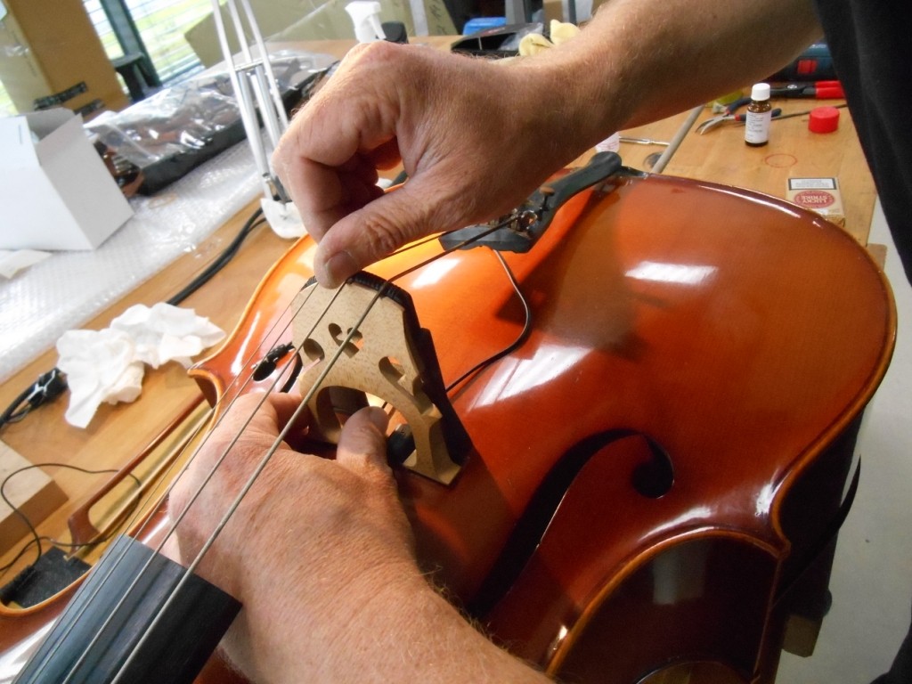 Sehr interessant der Einbau des PU: fiddle hat da einen "höhenverstellbaren Steg", der die Saiten hielt, wärend er den PU unterbaute: