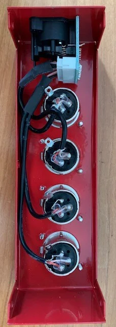 Die Rot-Weisse Box mit 4 XLR (ich sag mal vorsichtig "Schüttware") und 1 x RJ45 (Die RJ45 mit Tülle passen genauso wie Standard-Netzwerkkabel/Patchkabel mit aufgelegtem Schirm) ist aus Stahlblech und fasst sich zunächst mal wertig an.