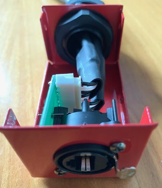 Die RJ45-Einbaubuchse sitzt auf einer kleinen Leiterplatte, die über einen Pfostenstecker die Verbindung zu den XLR-Einbausteckern herstellt.