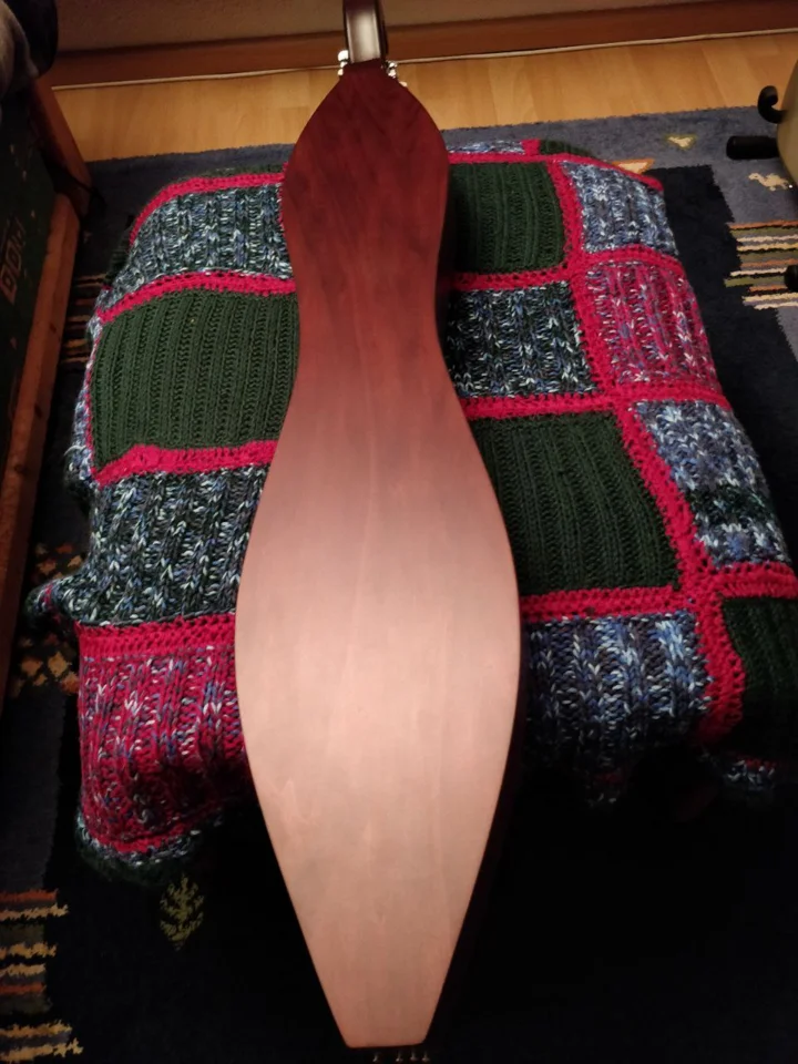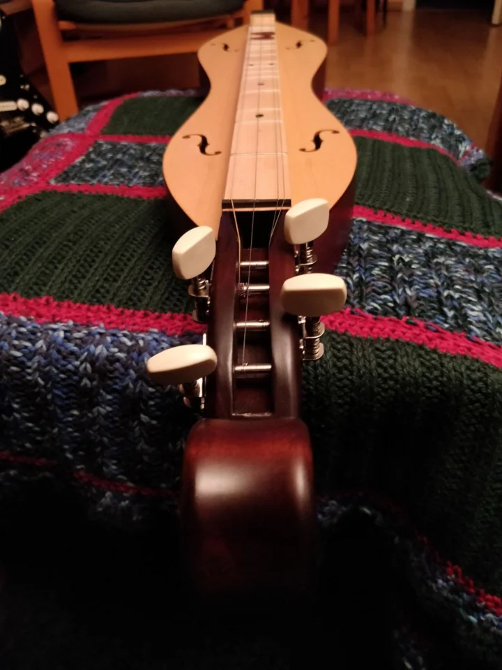 Optisch ein absoluter Hingucker, und, bis auf einen Griffbrett DOT, welcher schief in die dafür vorgesehene Mulde eingeklebt wurde, tadellos verarbeitet und mit ca. 970g relativ leicht. Die Beschaffenheit der Materialoberfläche des Korpusbodens ist recht glatt. Dies, sowie das recht leichte Eigengewicht können dazu führen, dass die Dulcimer beim Spielen von den Schenkeln gleitet. Hier kann die Befestigung eines Gurtes an beiden Enden des Instrumentes Abhilfe schaffen.