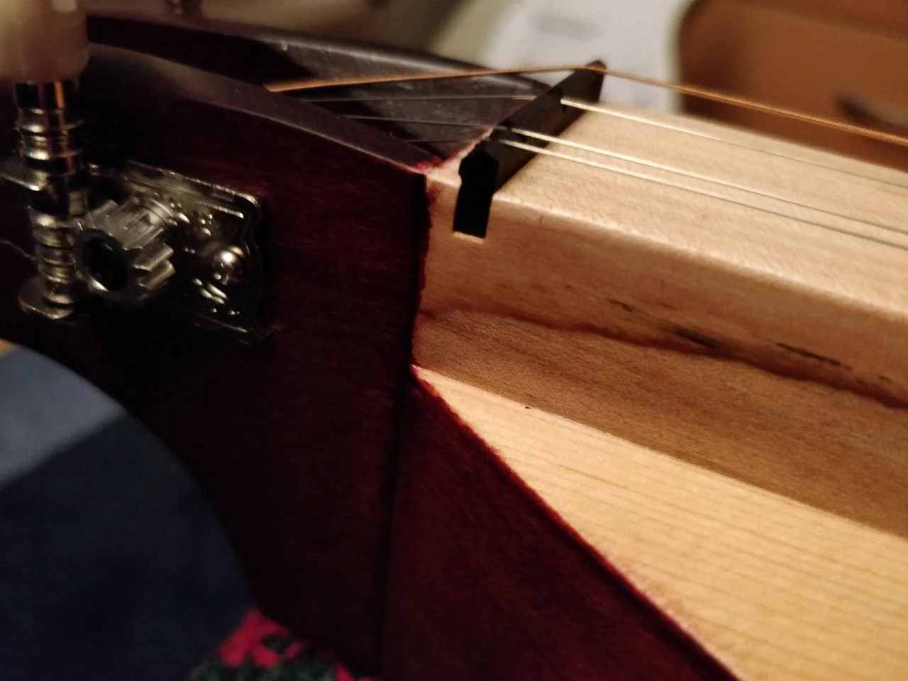 Ein wirkliches Manko stellte bei meiner Dulcimer, eine, über das gesamte Instrument hinweg, sehr hohe Saitenlage dar, welche das Instrument fast unbespielbar machte und letztendlich auch der Grund dafür war, diese meinerseits zu retournieren. Vermutlich hätte es ausgereicht, die beiden Obersättel jeweils an der Unterseite mit Schleifpapier ein wenig herunter zuschleifen.