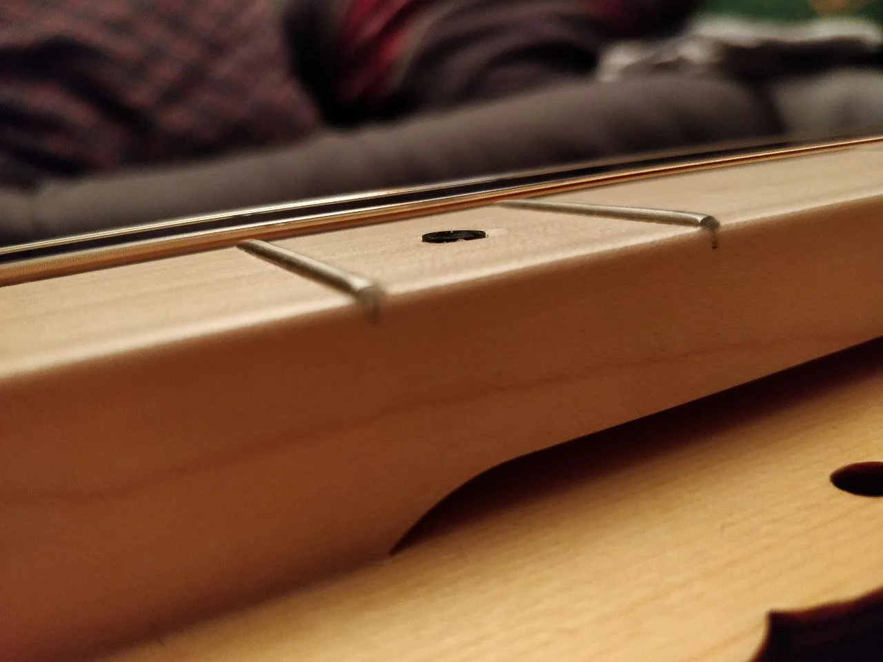 Die Bünde sind, zumindest von der Oberseite betrachtet, gut verarbeitet und sauber eingepasst – da schnarrt nichts. Wirft man einen seitlichen Blick auf die Bünde, sieht man, dass die Bünde zwar relativ sauber in die Kerben eingearbeitet wurden, welche aber ein wenig zu tief gesägt wurden.
