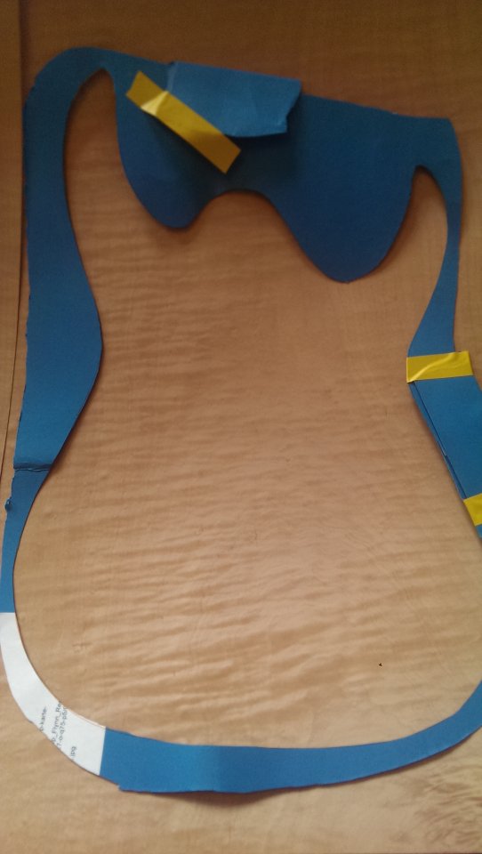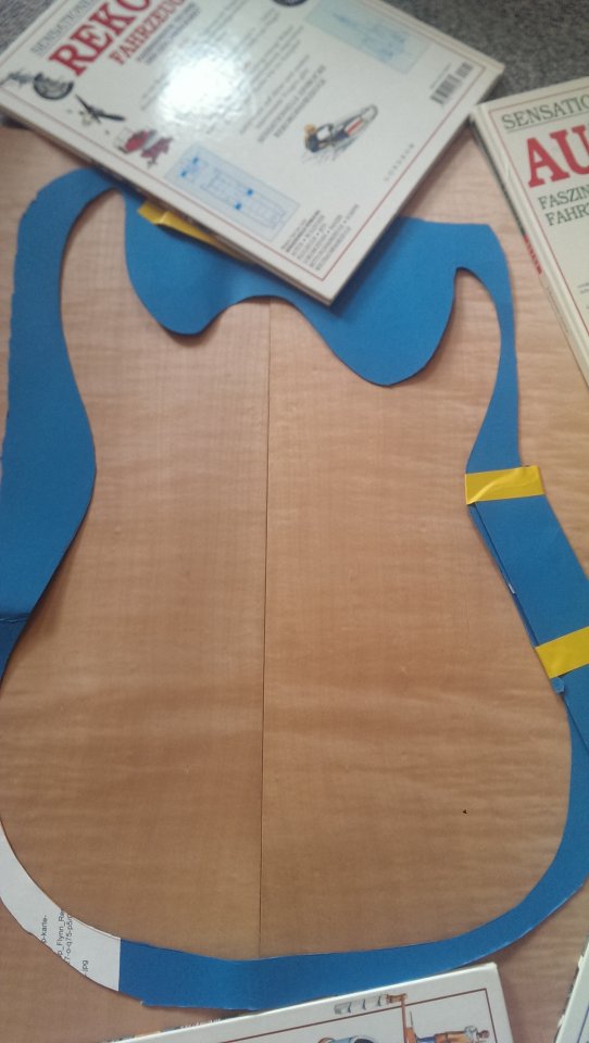Also bin ich zur örtlichen Tischler gegangen und er meinte er könnte das nicht so genau gerade und parallel zur Kante schneiden und hat mir generell geraten alles sein zu lassen. Er war auch der Meinung, dass der Übergang zwischen den beiden Furnieren in der Mitte vom Korpus niemals so genau wird. Sein Vorschlag war die Gitarre mit einen Stück Furnier zu furnieren wie in diesem Bild, was mit allerdings nicht gefällt: