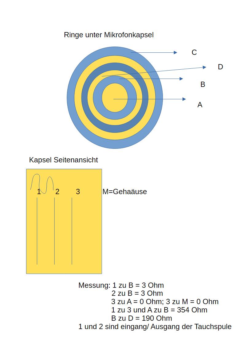 Ich habe ein nicht mehr zugelassenes Sennheiser e 835 Fuksystem und will nun den Handsender zu einem xlr kabelgebunden Mikrofon umbauen. So weit alles gut, habe auch bereits die Elektronik rausgeworfen und xlr Stecker angebracht. Nun habe ich allerdings einige Probleme bei der Steckerbelegung. Die Mikrofonkapsel hat ja 6 Ringe und wenn ich diese zur Kapsel durchmesse ist der Mittelpunkt und der äußere Ring miteinander und mit der Masse/ Abschirmung? verbunden. Die beiden Drähte der Spule, die meiner Meinung + und - sein sollten, sind beide mit dem (von innen gesehen) zweitem Ring verbunden. Zwischen Mitte und zweitem Ring sind ca 300 Ohm zu messen. Denk ich irgendwie falsch, weil eigentlich doch die Mitte an die 2 (+) des XLR steckers gelötet wird, der Ring daneben an die 3 (-) und die Abschirmung an die 1 und evtl mit der 3 verbunden.
