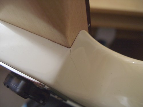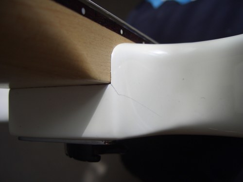 Ich hoffe ein paar erfahrene Gitarren-Experten sind unter Euch und können mir anhand von zwei Bildern etwas Furcht nehmen! Nämlich die Furcht das der Hals meiner neuen, gebrauchten Klampfe nicht angebrochen ist oder der Leim sich langsam löst. Ich habe das gute Stück gerade erst bei Ebay-England ersteigert. Es ist Baujahr 2003. Es handelt sich um eine seltene Dimebag Darrell Signature von Washburn, eine Dime-Slime welche an der rechten und linken Seite, da wo der Hals in den Korpus geleimt ist Risse hat.