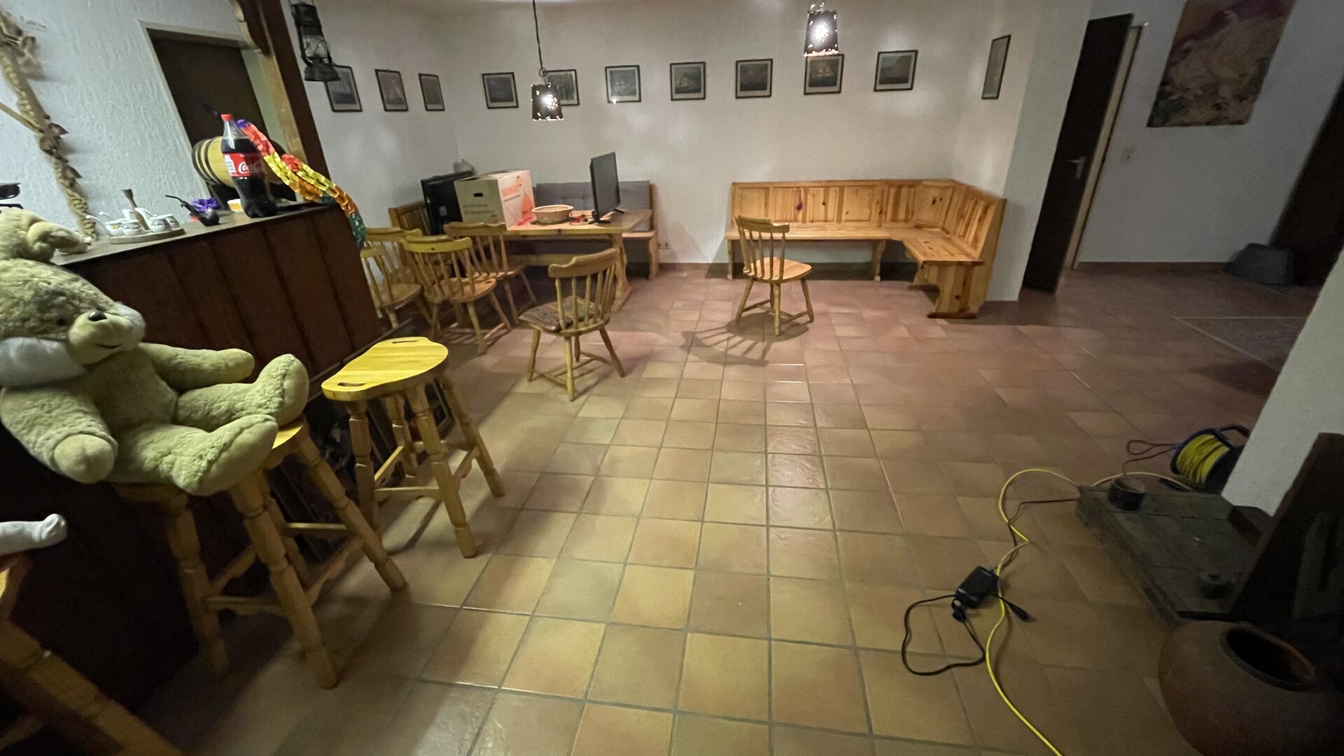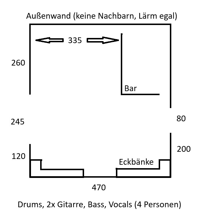 Endlich kann ich mir den Traum von einem Proberaum im eigenen Haus erfüllen! Die Men Cave ist in diesem Fall der ehemalige Partykeller. Das Schöne daran ist, dass eine Bar, Eckbänke und Tische auch schon vorhanden sind. Da wir im Industriegebiet leben, muss ich mich um die Nachbarn nicht kümmern, möglichst wenig Krach auf anderen Stockwerken hat also eher Prio.