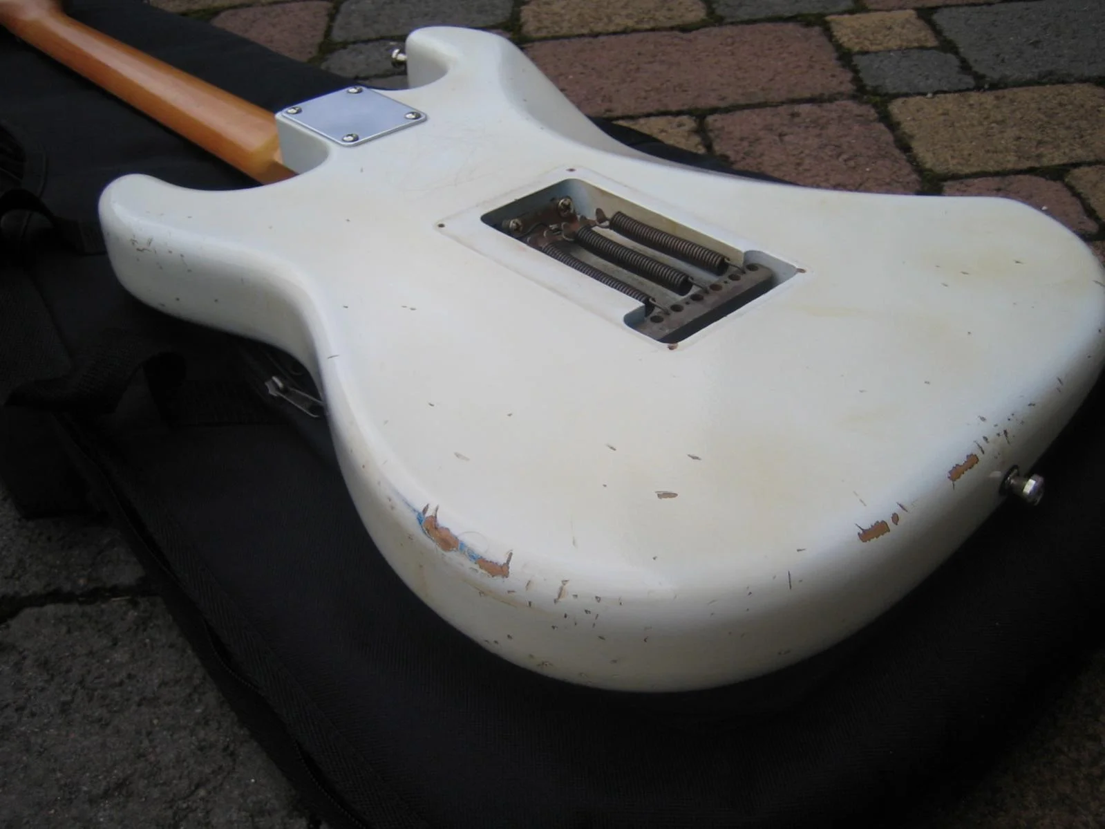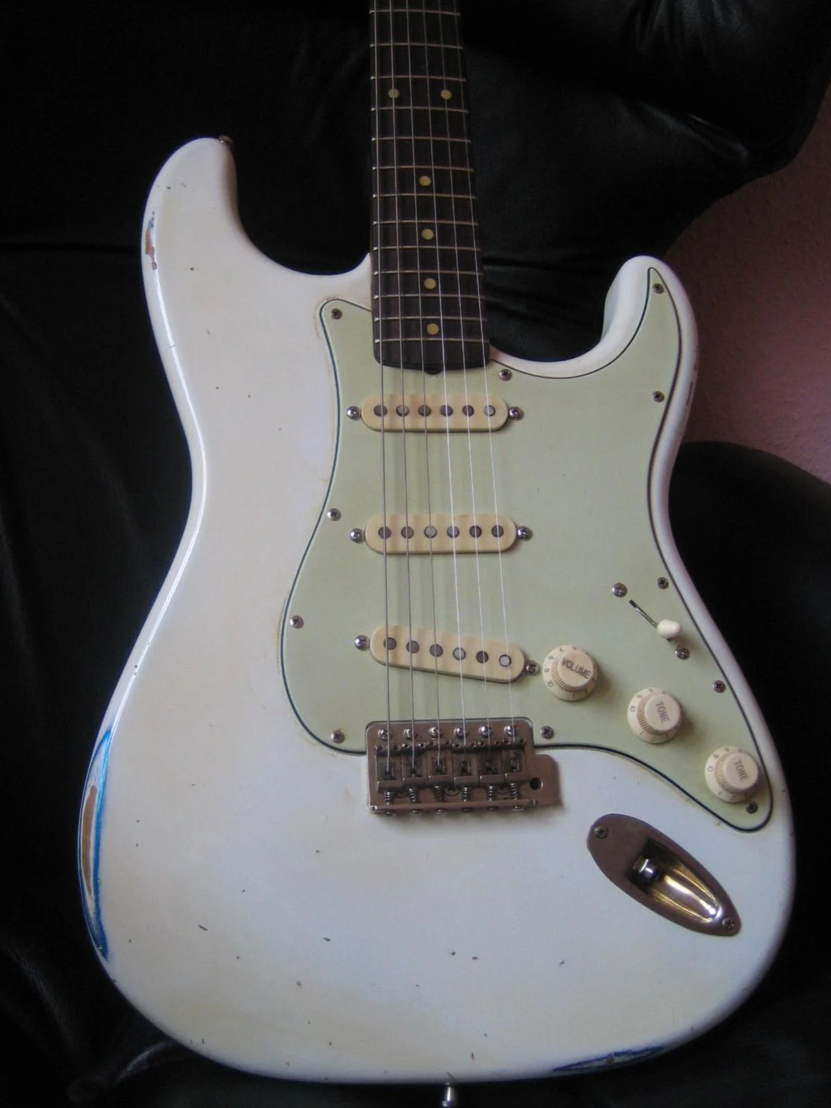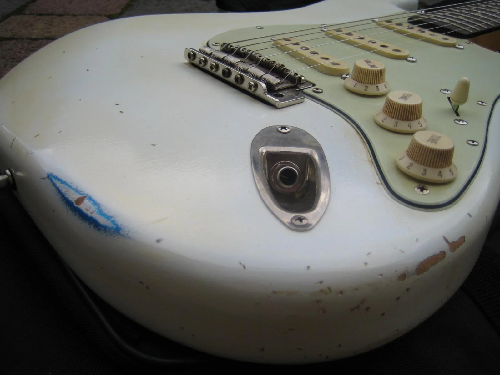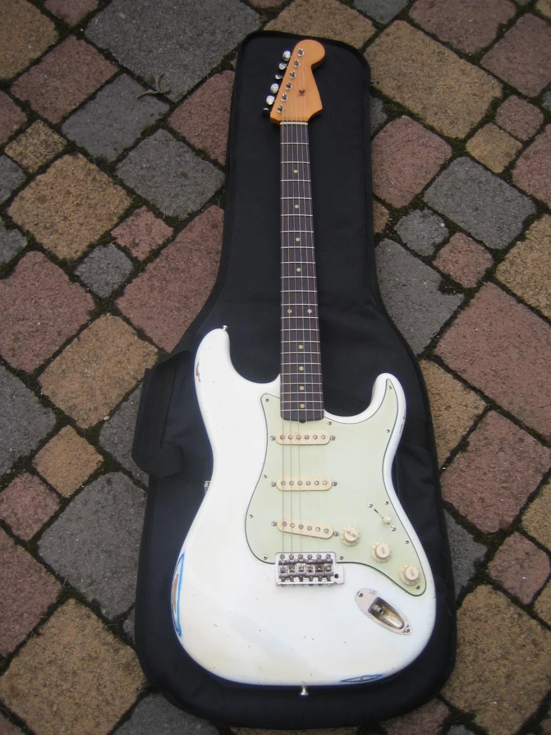 Fender. Auch sämtliche Hardware habe ich als aged gekauft. Die Klusons, die Klinkebuchse sowie das Tremolo mit Stahlblock sind mattiert und tragen, jedenfalls das Tremolo, leichten Flugrost. Die Plastikteile sind nachgegilbt und sehen leicht siffig aus... klanglich vergleiche ich sie, schlagt mich von mir aus, mit den Custom Shop Fender Strats. Ich hatte noch keine American Std. oder Vintage in der Hand die auch nur annähernd so gut war wie diese hier. Das Teil schwingt, echt wahnsinn. Sowas habe ich bislang nur bei Fender CS Relics erlebt. Anbei noch ein paar Bilder! Wer fragen hat, gerne
