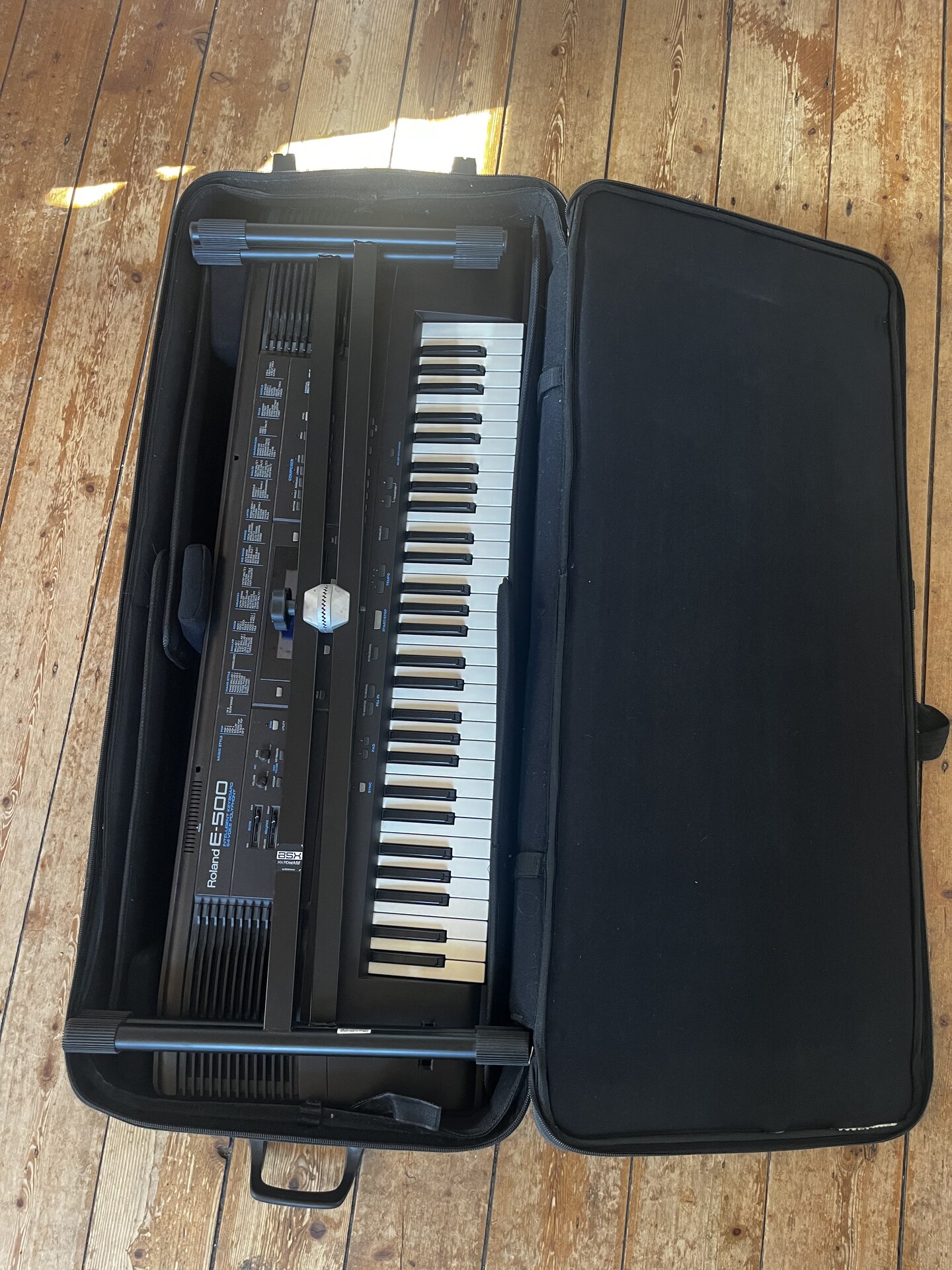 Ich habe ein Roland E-500 Intelligent Keyboard inkl. Zubehör, wie den passenden Ständer, Koffer und mehrerer Disketten.