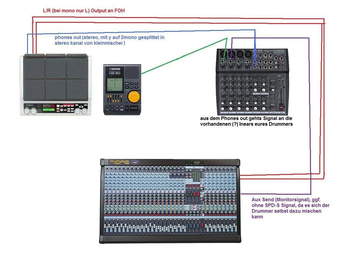 Gestern meinte der Tontechniker wir sollen uns einen Kleinmixer anschaffen um nur noch das an die PA zu schicken, was auch wirklich zu hören ist und ausßerdem könne er dann nen Signal zurückschicken und der Schlagman macht sich sein eigenens Monitoring.