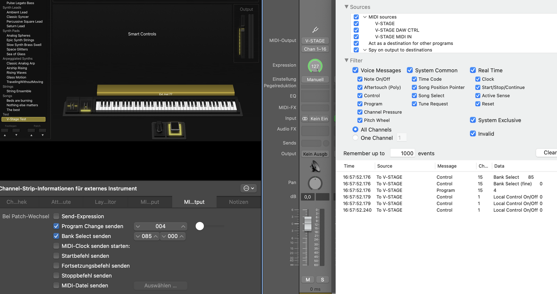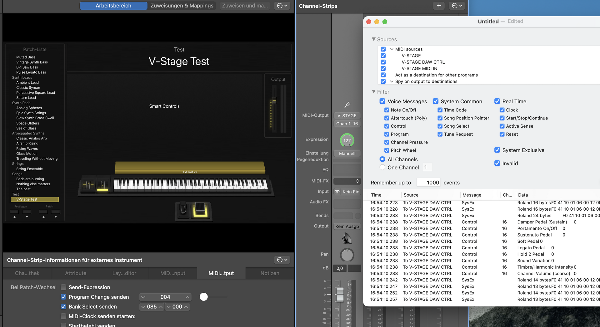 Ich kann also z.B. in Logic eine Mehrspuraufnahme von meinen Klangerzeugern in einem Rutsch auf separaten spuren machen. Es steht dann auch eine Schnittstelle zu Mainstage zur Verfügung und ich kann über das Display des V-STAGE die Mainstage Patches auswählen und sogar Parameter ändern. Leider habe ich da jetzt noch Probleme, dass ich keinen vernünftigen Mischbetrieb hinbekomme, wenn die Program Changes und Bank Selects in dem Mainstage Steuermodus nicht funktionieren, um z.B. den Pianoklang auf dem V-STAGE durch Mainstage auszuwählen.
