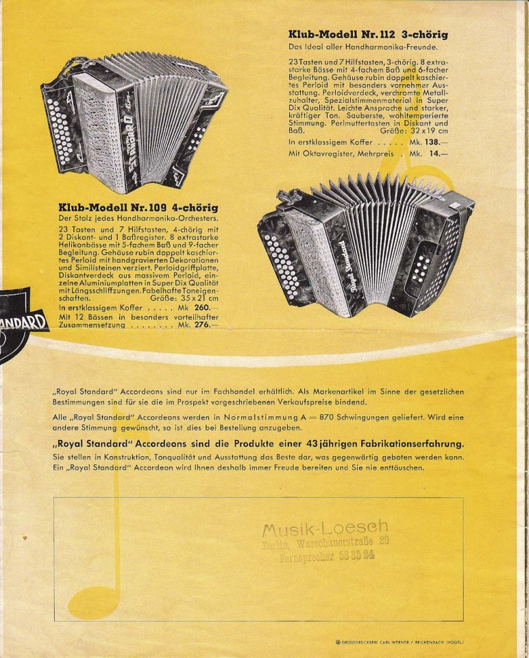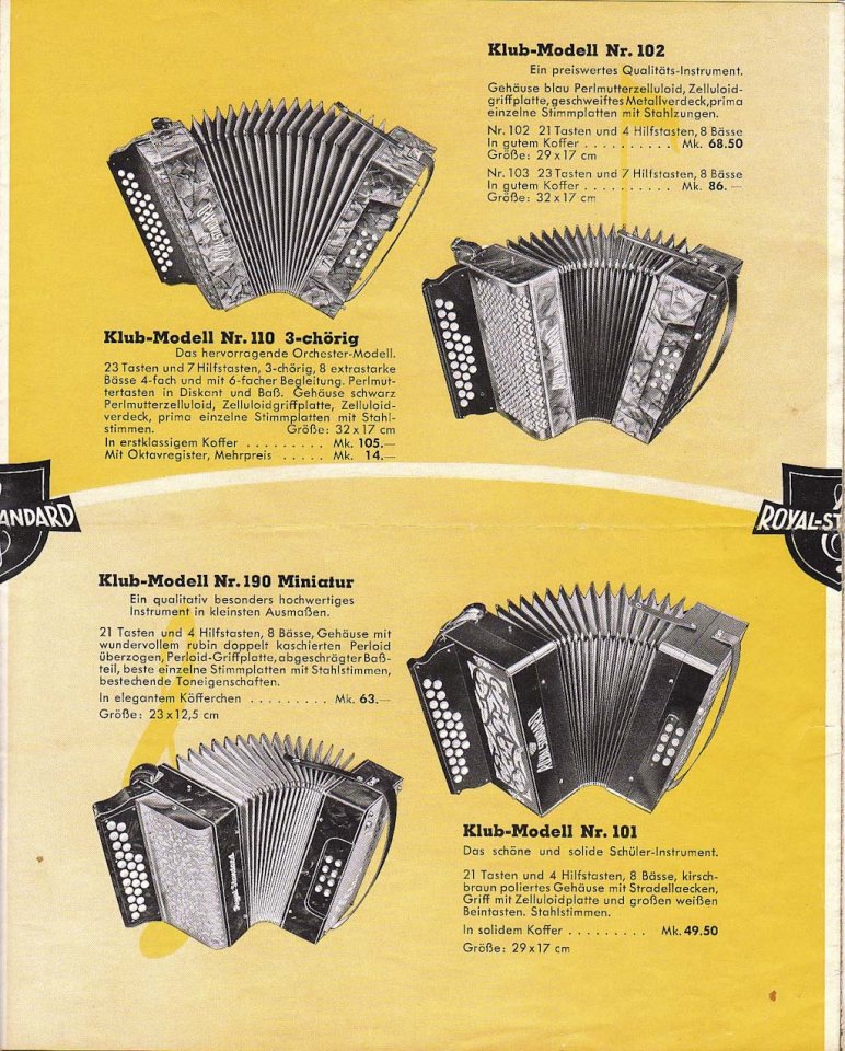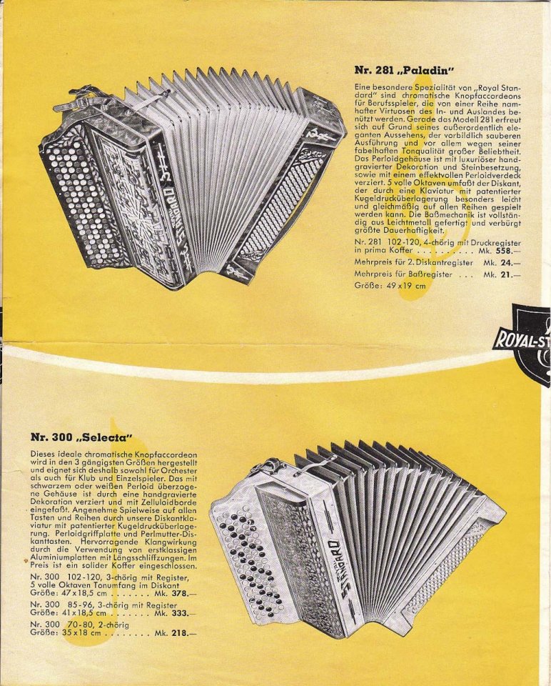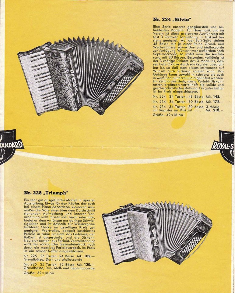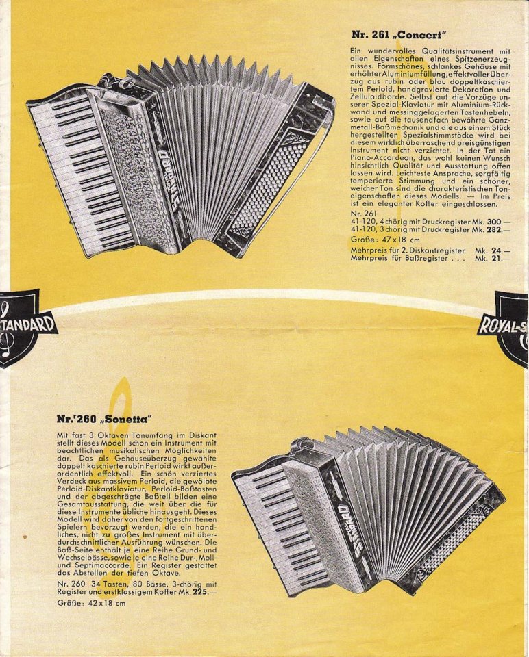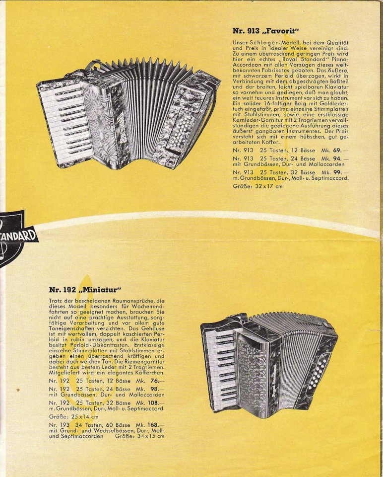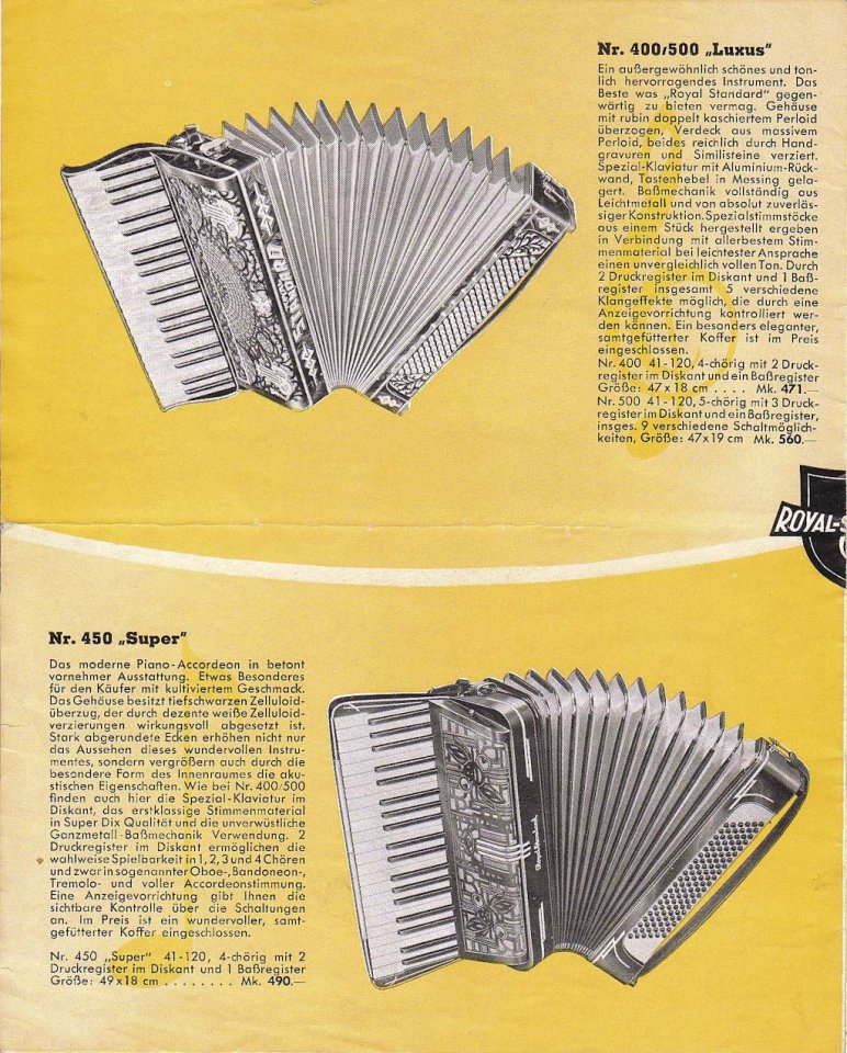 ich bin in den Besitz eines sehr alten Royal Standard-Akkordeons (mit Metallgitter auf der Diskantseite) mit nur 12 Bässen gelangt. Die Baßseite ist eine Wucht! Kräftig und volltönend, wie Orgeln oder Waldhörner. Herrlich finde ich auch die Abstimmung zwischen den Terz-und Akkordbässen. Die Diskantseite geht.