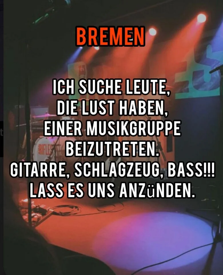Hallo! Mein Name ist Dasha, ich bin 18 Jahre alt und lebe in Bremen. Ich habe den großen Wunsch, eine Rock- oder Popgruppe zu gründen (wir können uns einigen). Ich singe, wenn es in dieser wundervollen Stadt Gitarristen, Bassisten und Schlagzeuger gibt, antworten Sie bitte. Meine Arbeiten könnt ihr auf Instagram sehen. (daria_platonovva)