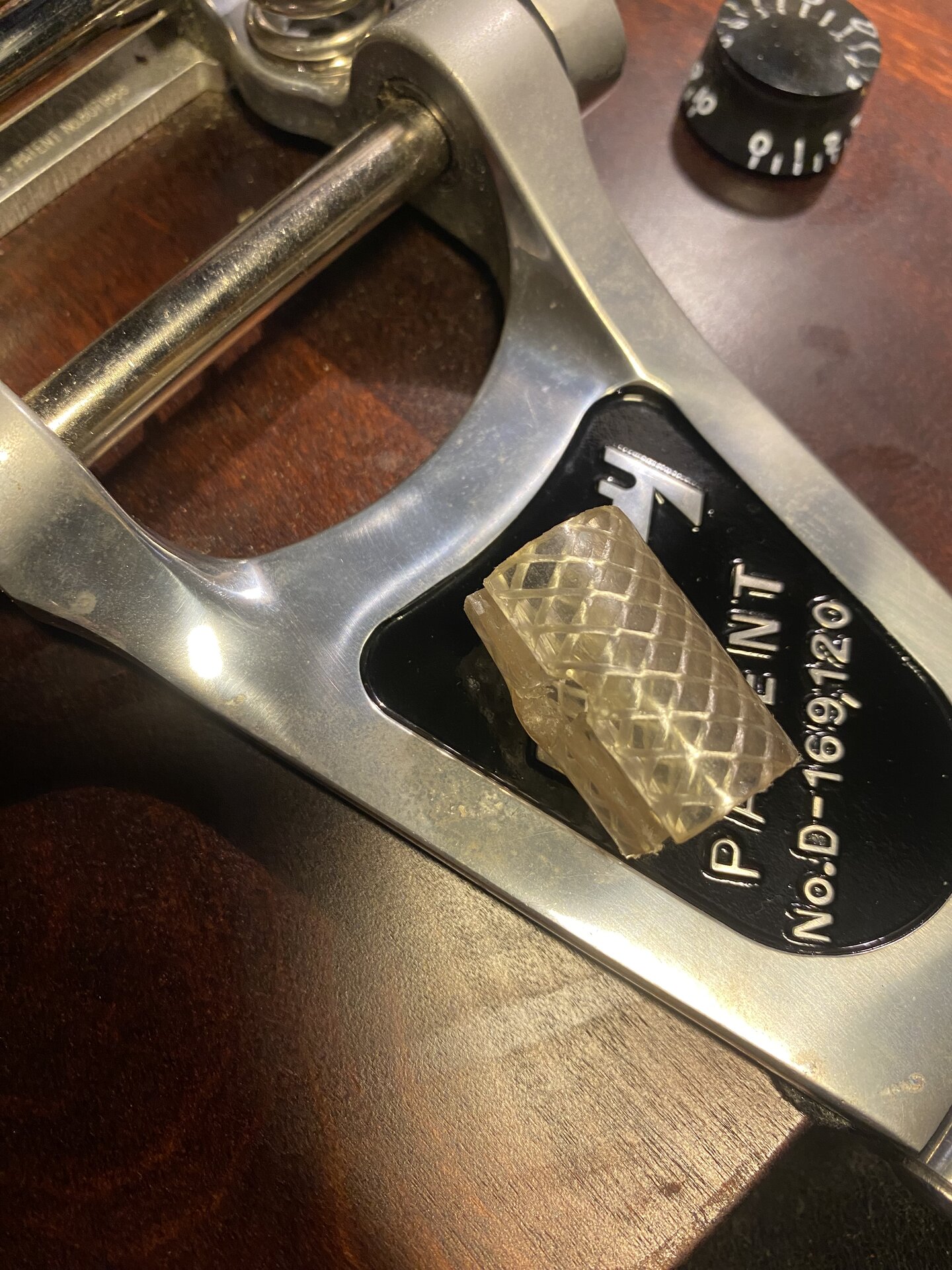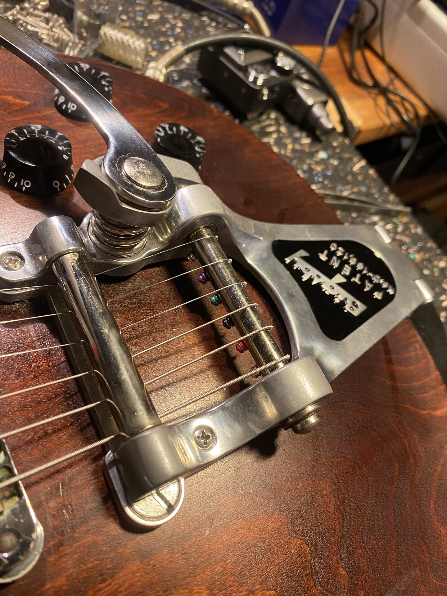 Doch um diesem Review vielleicht doch etwas zusätzlichen Mehrwert zugeben -und das Bild der alten Saiten deutet es schon an- diese Les Paul ist mit einem Bigsby Vibrato ausgestattet und ich habe hier mal dokumentiert, wie ich da die Saiten wechsele, ohne in Verzeiflung oder Wutanfälle zu geraten, denn Bisbygitarren zu besaiten, ist eine kleine Challange: