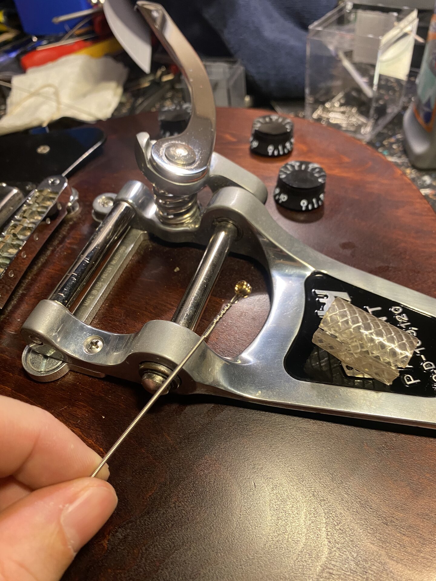 Die Saiten, wie sie aus der Packung kommen, "passen" schlecht oder nicht so recht auf die Pins des Bigsby, worauf die Ball End aufgesteckt werden.