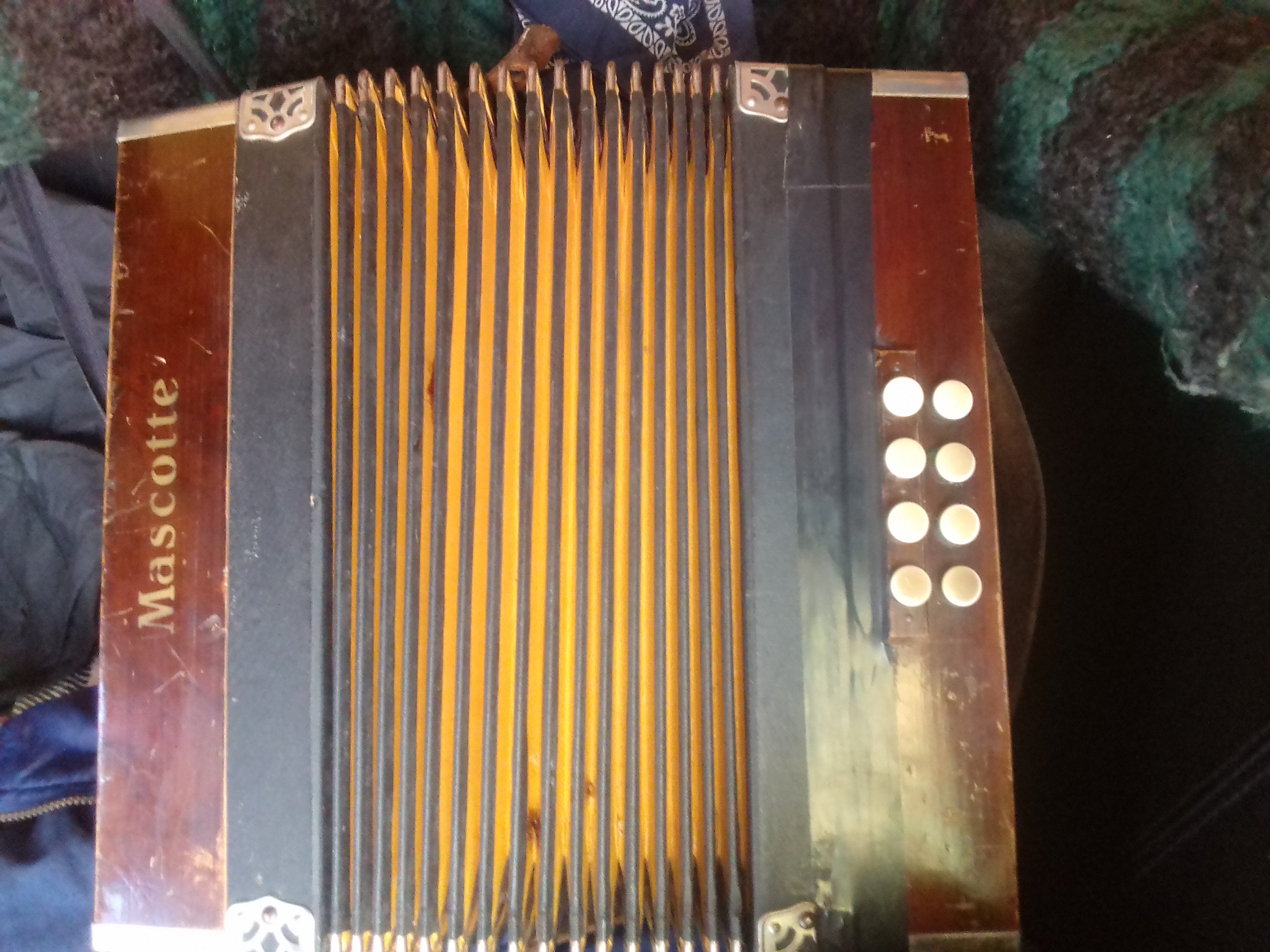 Genau so ist es. Das Foto zeigt die Diskantknöpfe nicht. Aber wahrscheinlich sind die Knöpfe dort in drei Reihen angeordnet: Die äußere zu 11, die mittlere zu 10 und die innere zu 4 Knöpfen. Das ist eine kleine Club-Handorgel oder Club-Harmonika oder so. Lehrmaterial dazu gibt’s kostenlos im Netz.Ich habe dieses akkordeon gefunden. Es steht mascotte drauf es hat an einer seite 8 an der anderen 25 knöpfe und es tönt wenn ich den balg bewegen und die knöpfe drücke. Ich denke die 8 sind die bässe.die 25 einzelne noten?
