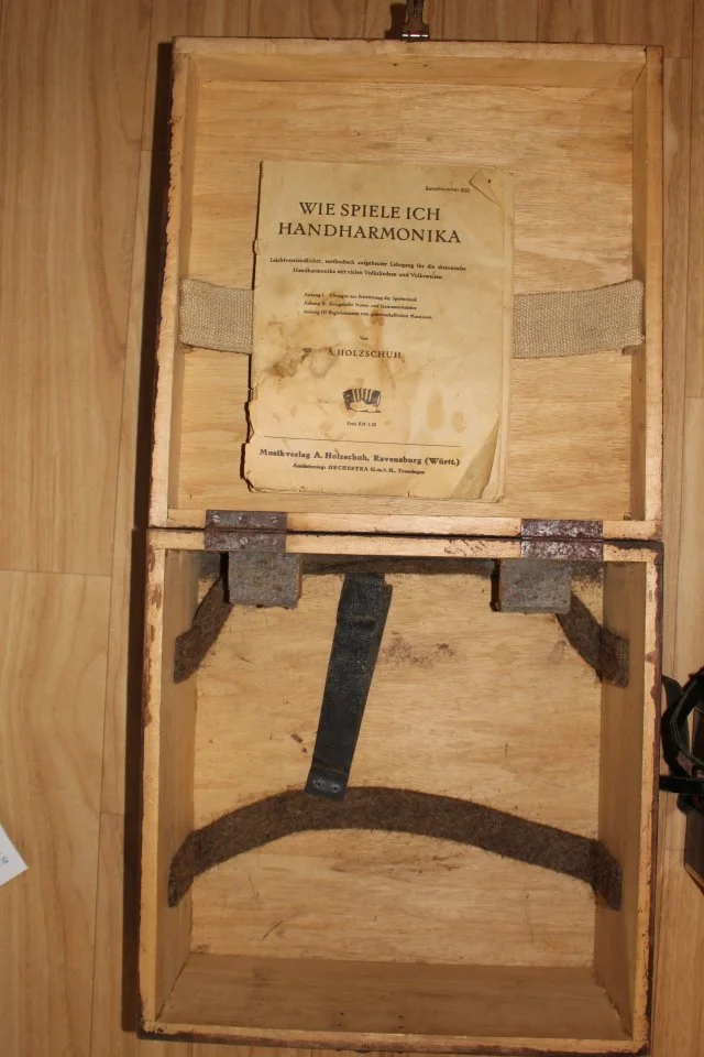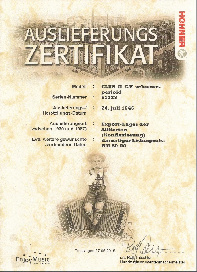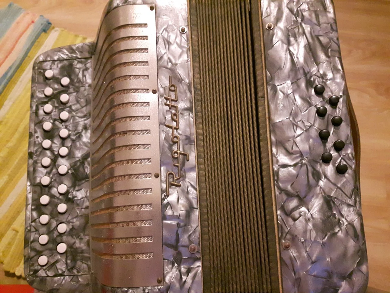 Hm. Im Internet habe ich ein paar Bilder anderer Rigolettozweireiher gefunden. Etwas irritiert hat mich, dass die Instrumente zum Teil eine Made-in-Germany-Plakette tragen. Nun bin ich auf ein altes Ebayangebot eines solchen Rigolettozweireihers aus den USA gestoßen (leider sind die Bilder inzwischen gelöscht), in dem der Verkäufer schrieb:Das sieht aus wie ein altes DDR-Akkordeon.