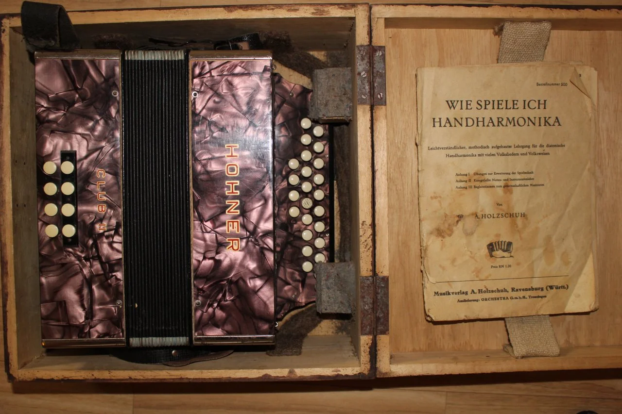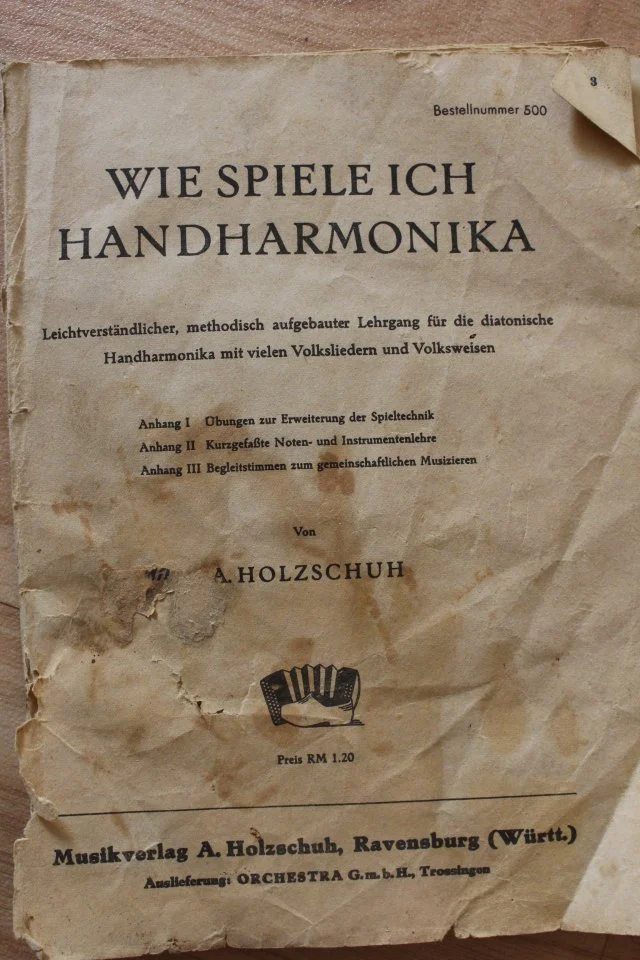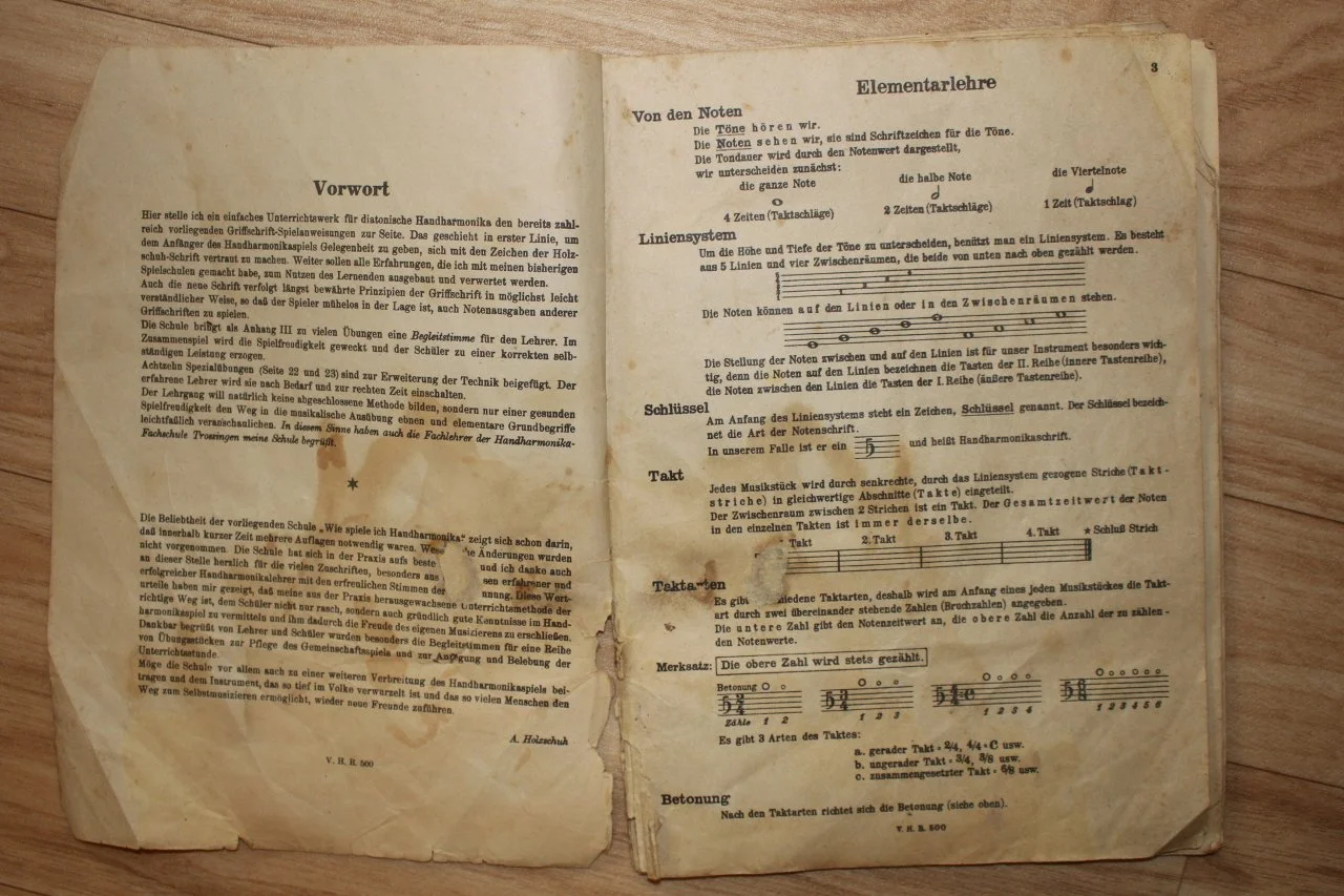 Moin! Das sieht aus wie ein altes DDR-Akkordeon. Der dritte Knopf jeder der beiden Reihen auf Druck ist der Grundton der jeweiligen Reihe. Du kannst darauf zum Beispiel (ganz ohne Noten) erstmal Alle meine Entchen spielen. Die zugehörigen Bässe und Akkorde sind auf der linken Seite auf der äußeren Reihe: die ersten beiden Knöpfe sind für die innere Diskantreihe, die anderen beiden sind für die äußere Diskantreihe. Das reicht zum Anfangen. Dann kannst du selbst durch Rumprobieren mehr rausfinden (oder hier noch mal fragen).Ich hab neulich eine zweireihige diatonische Harmonika gefunden. Jetzt stellt sich mir die Frage welche Töne denn rauskommen wenn ich die Knöpfe drück. Würde nämlich gerne ein bisschen spielen und mir Noten besorgen.