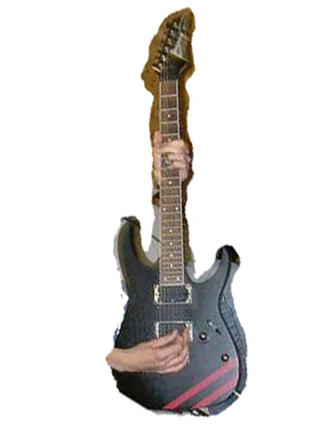 Ibanez; hals nach unten zeigend; (normale) "punkte" auf Bünden 3,5,7,9,12... (statt flamen oder sonstigen schnick schnack); 2 humbuker mit silbernem rahmen, 2 tonregler, ein regler zum verstellen der tonabnehmer;griffbrett (von vorne) bräunlich insgesamt scharz(-grau)...nicht glänzend, eher matt; und das besonderste schönheitliche merkmal die beiden roten streifen unten links...sind diese auf der gitarre drauf oder selbst angeklebt??