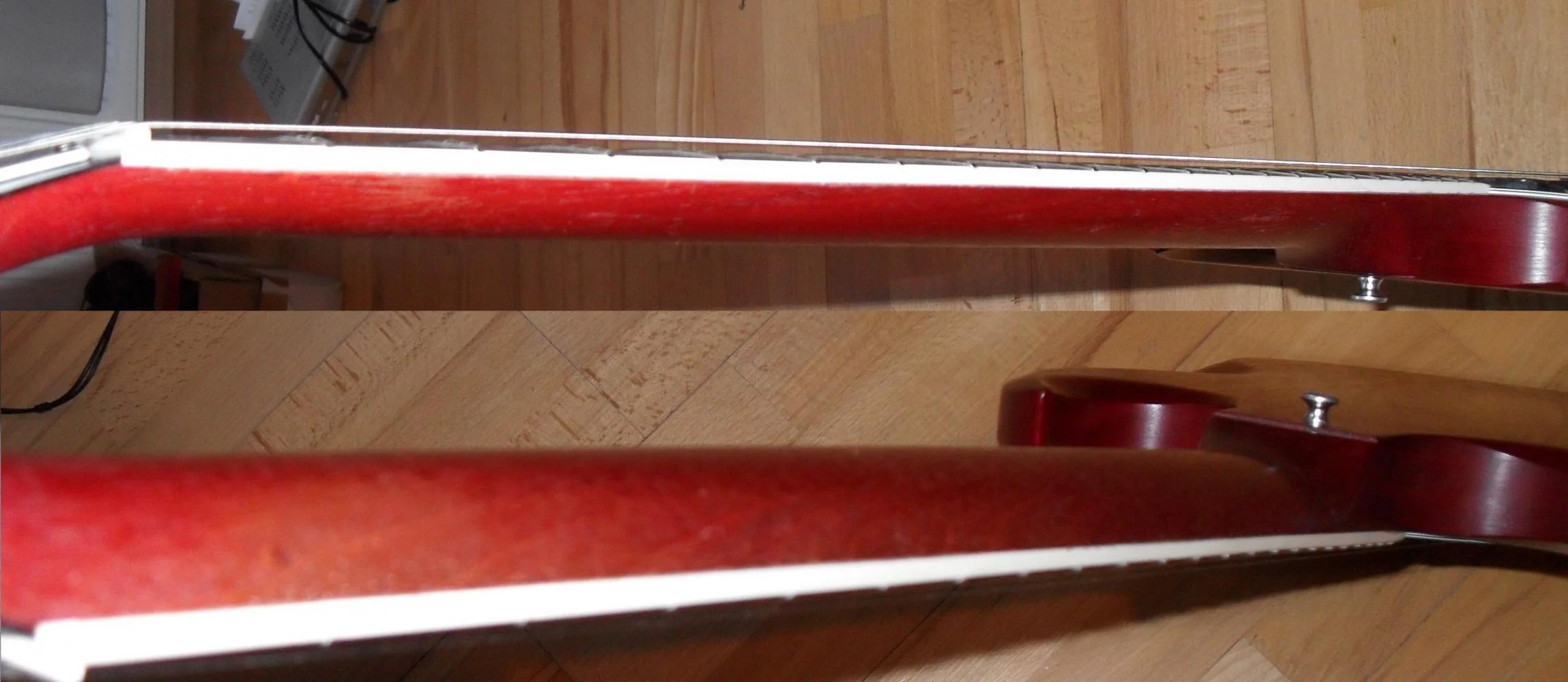 Die DP 2T hab ich auch schon gesehen. ABER DAS IST SIE NICHT. DP 2T hat serienmäßig nen Tone-Selection-Regeler (solo/sharp/wild). Den hat meine nicht. Nicht mal das Loch dafür. Außerdem ist die DP nen 335erNachbau und hat - als solche - nen längs durch den Korpus laufenden Balken. Hat meine auch nicht. Meine ist komplett hohl (bis auf Stabilisatoren).
