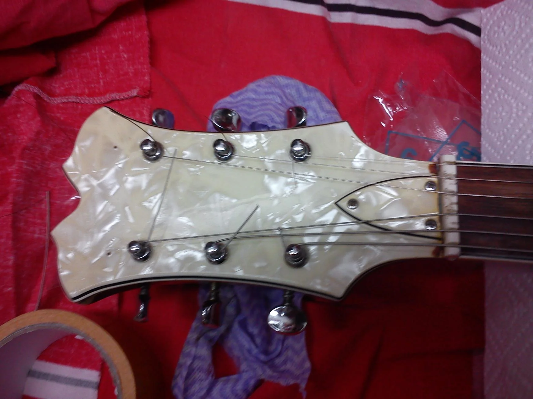 Es handelt sich um eine Jackson Kelly. Die PUs tragen einen Seymour Duncan Aufdruck, sie hat ein Tremolo, einen Poti, einen transparent lackierten Hals und die Seriennummer: 9827691 . Mechaniken sind allesamt mattschwarz lackiert, sie ist wohl an die 2 Jahre alt.