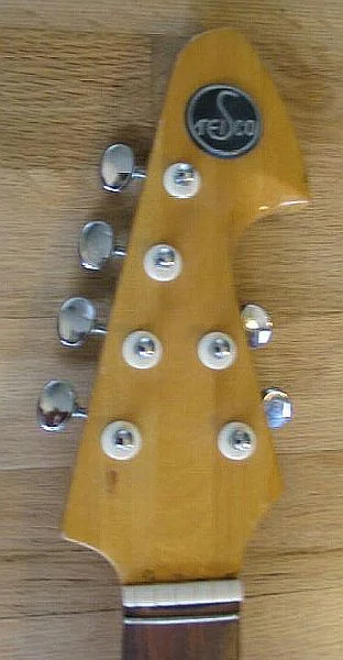 Ich habe diese Gitarre vor kurzem auf einem Flohmarkt für 20Euro erstanden!!Gekauft habe ich sie,weil sie ein paar Details hat,die mir gefallen,u.z.:der Sattel,das Neckplate und die Saitenreiter sind aus Messing!Der Halzspannstab wird von der Korpusseite eingestellt(ist verdeckt vom Pickguard!!).