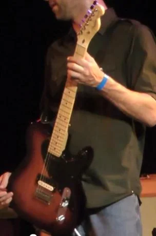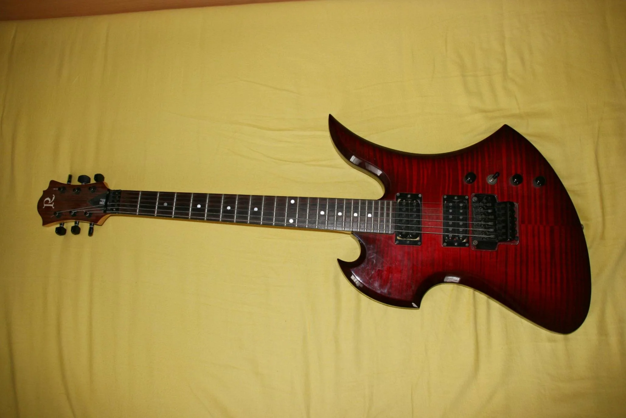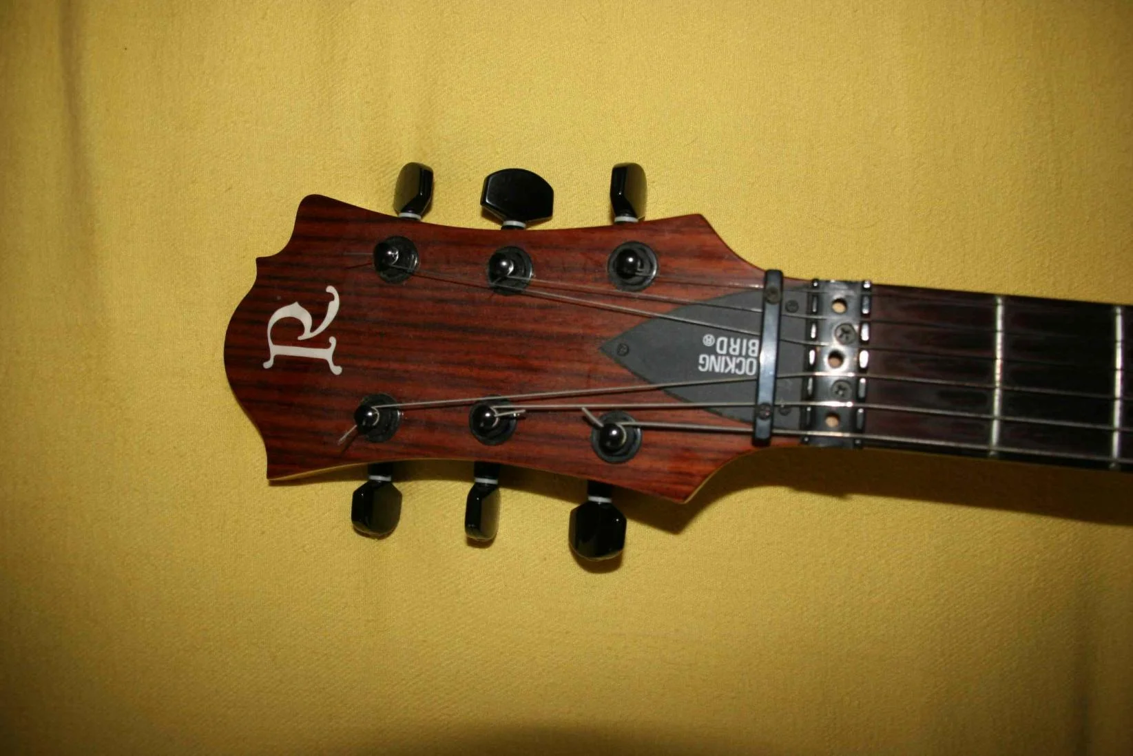 Kein Schlagbrett, normales Tremolo, das sich aber nur nach unten drücken, und nicht nach oben, ziehen lässt. Der Korpus erinnert stark an eine JEM, bis auf den Griff natürlich.