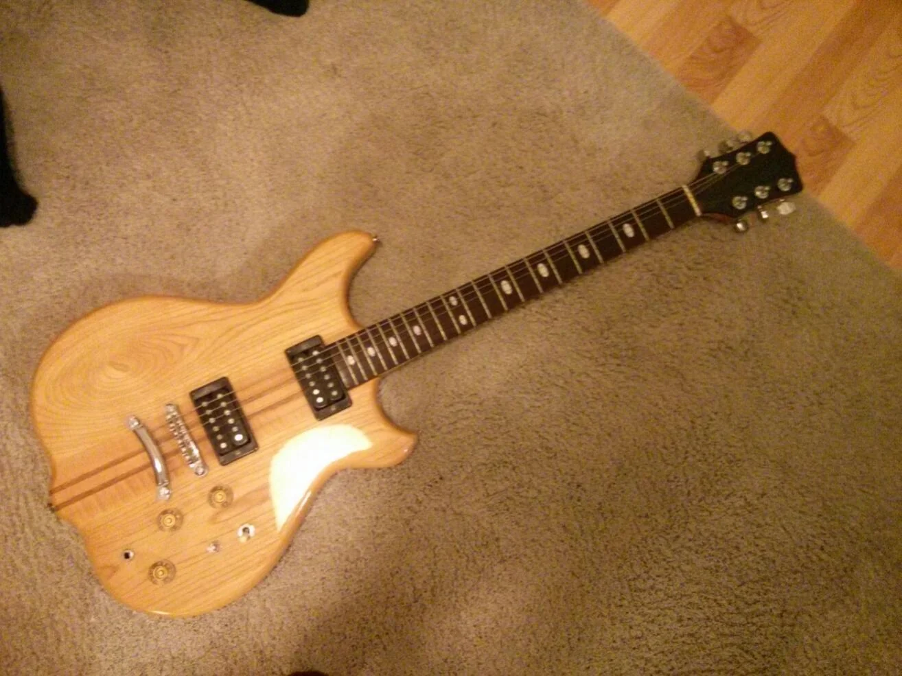 Habt ihr noch ne Ahnung was die Klampfe jetzt wert ist? Sie ist umlackiert worden, aber vom Fachmann. Sie hat außerdem 2 Ibi/Dimarzio Pickups aus ner Ibi Prestige und nen lizensiertes Floyd Rose.