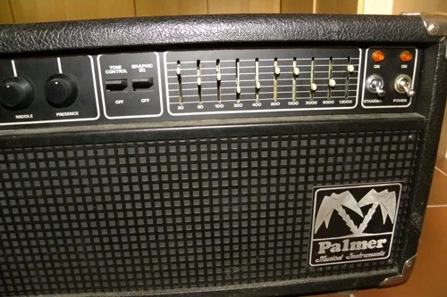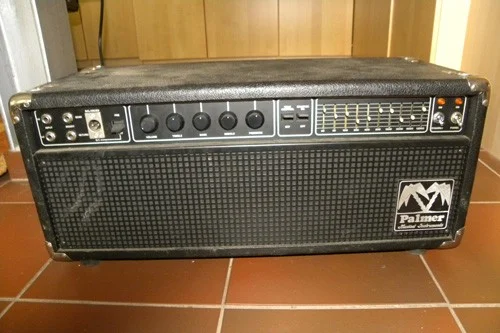 ".. handelt sich um ein Palmer Model 6 (MkII) mit Röhrenvorstufe und Transistorendstufe. Der Verstärker wurde zwischen 1985 und 1989 gebaut. Wenn man die Rückwand abnimmt, sollte eigentlich ein Aufkleber auf dem Chassis zu finden sein, der das Prüfdatum angibt. In der Vorstufe sind 4 Röhren verbaut 2x ECC83 und 2x ECC82. Letztere sind für den EQ zuständig. Die einkanalige Vorstufe verfügt über 2 Klangregelmöglichkeiten, den üblichen 4 Band Klangregler mit Bass, Mid, Treble und Presence und einen 10 Band Graphischen Equaliser. Beide Klangregelungen sind schaltbar, sodass man für unterschiedliche Sounds Presets einstellen kann. Neben den Eingangsklinken (HI/LO unterschiedliche Empfindlichkeiten für aktive oder passive Bässe) gibt es 2 weitere Klinkenbuchsen Send/Return. Sie bilden einen seriellen Einschleifweg für Effektgeräte. Ebenfalls auf der Front der trafosymmetrische DI-Ausgang schaltbar Pre und Post (vor und nach der Klangregelung).