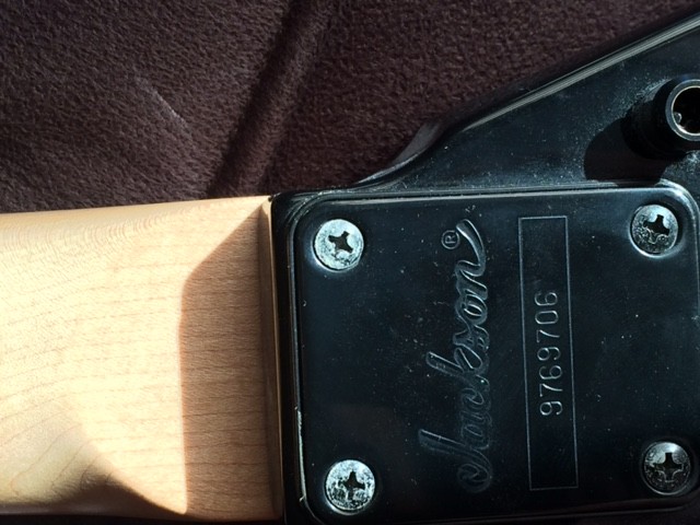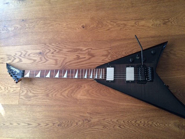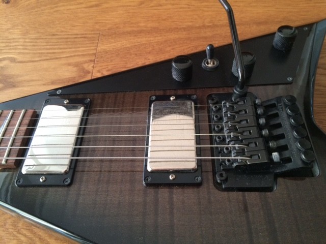 Es handelt sich um eine Jackson RR 3, gekauft habe ich sie im Jahre 2009. Die Pickups wurden ausgetauscht, eingebaut sind EMGs (60/81), und zwar das "25th Anniversary"- Set (die Gravuren konnte ich mit leider nicht zur Darstellung bringen, meine gute Kamera ist grad nicht greifbar). Der Body ist Erle, installiert ist ein Floyd Rose. Der Zustand ist gebraucht (wie man auf einem Foto erkennen kann), insgesamt würde ich den Zustand aber als gut bezeichnen.