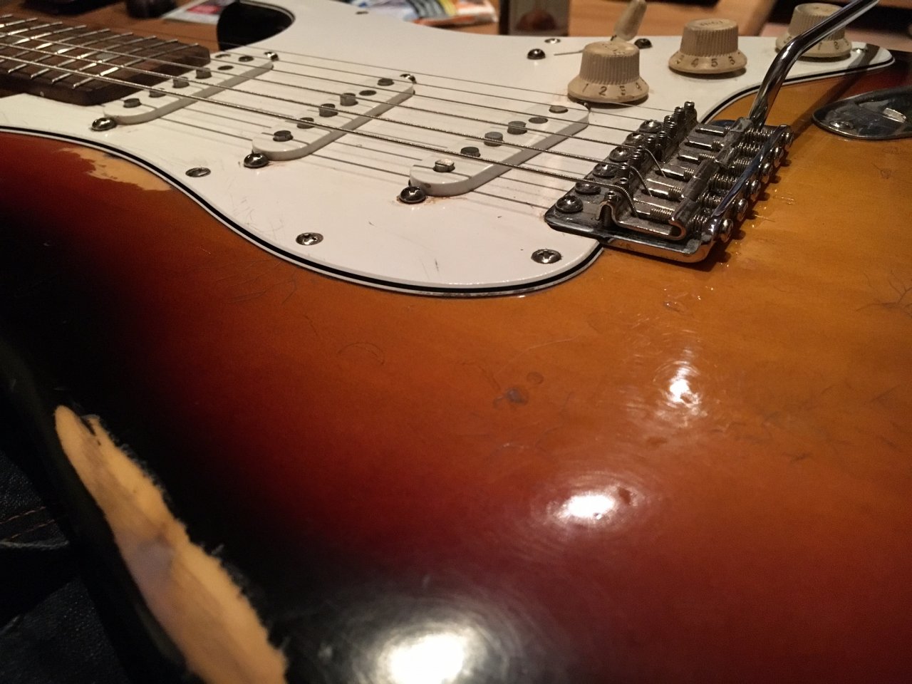Außerdem ist das Tremolo schwebend eingestellt, ohne Probleme mit dem Sattel und den Mechaniken was Stimmstabilität anbelangt, Saitenzug entsprechend am Federzug berücksichtigt.