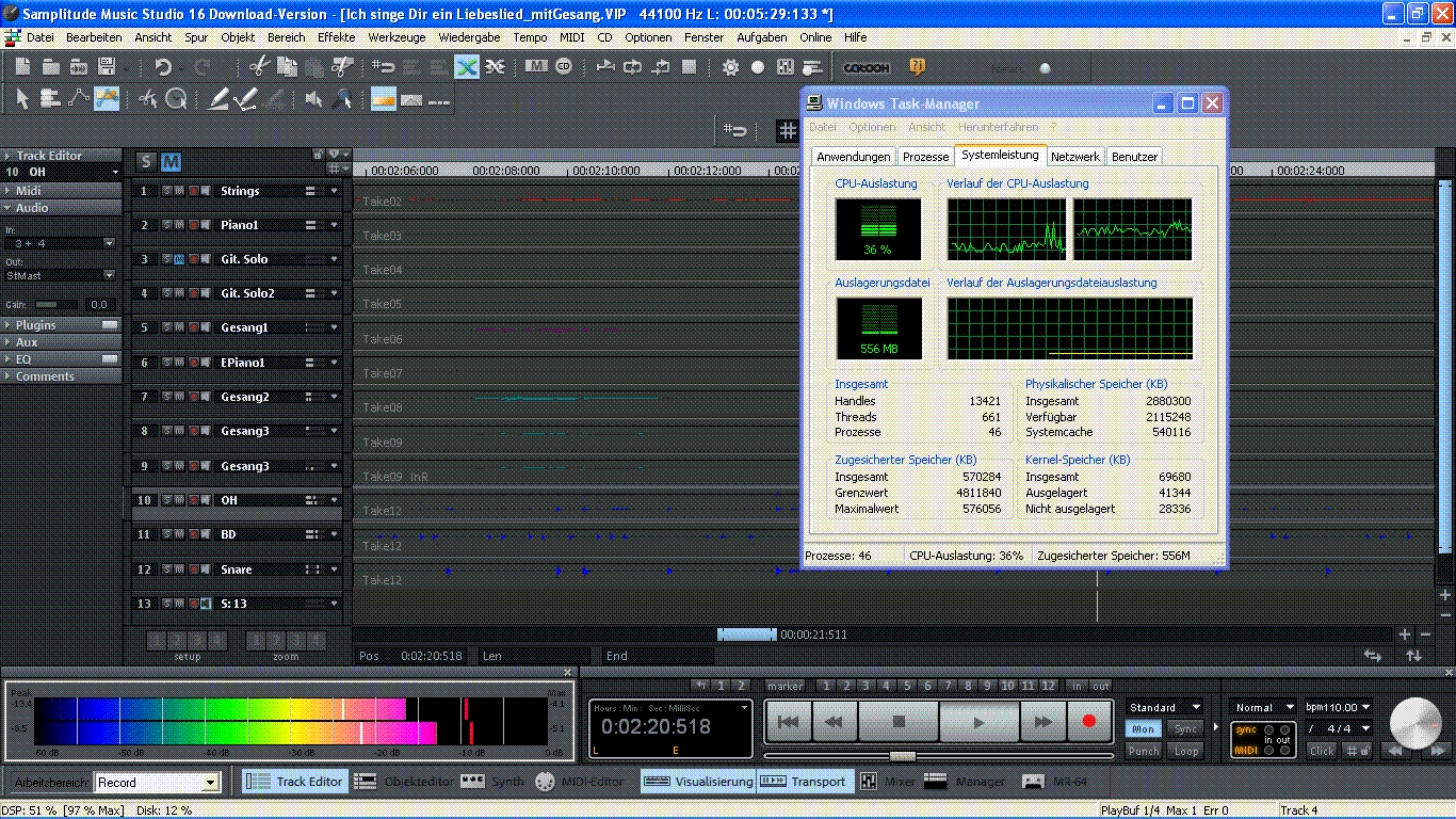 An diesem schönen Sonntag habe ich mich wieder ein wenig meinem ersten Aufnahmeprojekt gewidmet und ein paar Spuren eingespielt und eingesungen. Dann noch ein paar Effekte drauf (Hall, Kompressor) und "fertig" ist die Kiste.