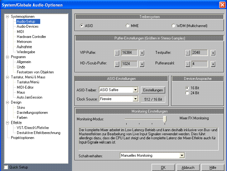 Vielleicht kann mir ja jemand helfen? Ich verwende Asio-Treiber. Zum Test habe ich den VIP-Buffer mal ein paar Stufen höher gestellt, aber das hat nichts bewirkt. Ich fahre das Saffire Interface im "Zero Latency Tracking", d.h. die Signale werden direkt in der DSP verarbeitet.