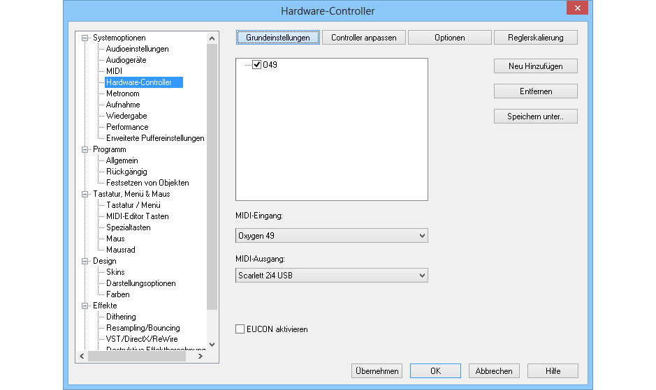 3. Erstellen Sie einen neuen Controller über die Schaltfläche "Controller wählen" > "#Neu". Vergewissern Sie sich vorher, dass unter "Factory Presets" noch keine Vorlage für Ihren Controller existiert. Sollte das doch der Fall sein, brauchen Sie nur diese Vorlage auszuwählen und Ihr Controller ist einsatzbereit. Falls anschließend eine Abfrage zur Aktivierung des MIDI-SysEx-Eingangs erscheint, beantworten Sie diese mit "Ja".
