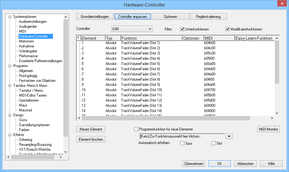 - Sollte ein Anlernen eines Bedienelements nicht möglich sein, überprüfen Sie zunächst im "MIDI-Monitor" (Reiter "Controller anpassen"), ob beim Bewegen des Elements überhaupt MIDI-Daten empfangen werden. Sollte das nicht der Fall sein, ist Ihr Controller entweder falsch konfiguriert (falscher MIDI-Anschluss oder falscher interner Modus des Controllers) oder das betreffende Bedienelement sendet keine Daten (andere Elemente funktionieren). Ist letzteres der Fall, können Sie das Element leider nicht verwenden.