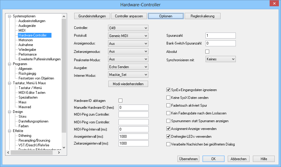 6. Wählen Sie unter dem Reiter "Optionen" als Protokoll "Generic MIDI" und stellen Sie als Spurenanzahl die Menge der Bedienelemente ein, die Ihr Controller besitzt (Beispiel: Verfügt Ihr Controller über 8 Fader, so geben Sie "8" ein. Hinweis: Sind Sie sich unsicher, lassen Sie diesen Wert auf "0".) Die übrigen Werte belassen Sie auf den Standardeinstellungen (Ausgabe: "Echo Senden", Interner Modus: leer).