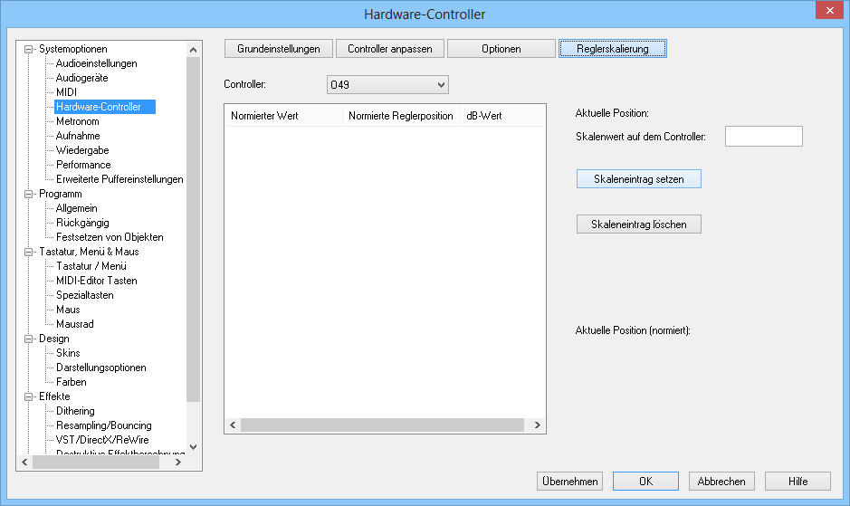 - Sobald Sie die Hardware-Controller-Einstellungen geöffnet haben, befinden Sie sich automatisch im Easy-Learn-Modus, das heißt jede Mausbewegung eines Mixer- oder Plug-in-Parameters bewirkt ein Anlernen desselben auf das zuletzt berührte Bedienelement Ihres Hardware-Controllers.