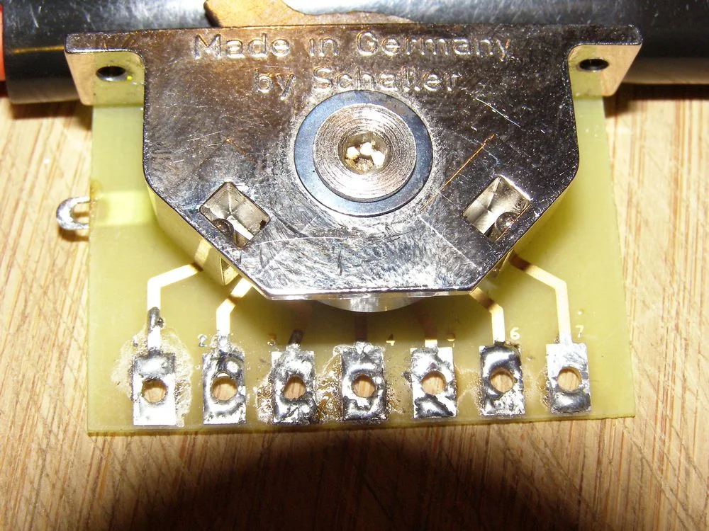 ich habe ein Problem und zwar habe ich einen Schaller 5 way switch in meiner Bastelkiste der in meine Strat soll. Leider habe ich keinen Plan von dem Schalter und bin mir auch nicht sicher ob das ein normaler 5 way switch ist. Wie man sehen kann hat er 7 Kontakte.