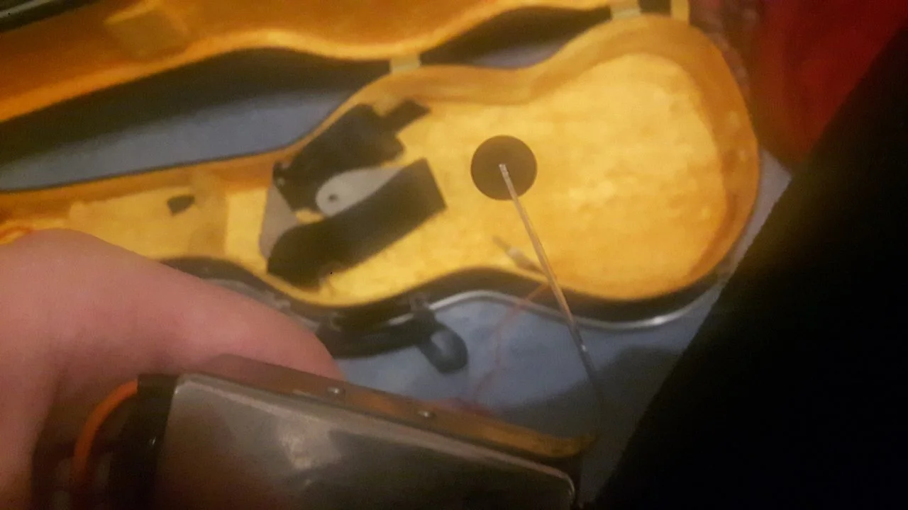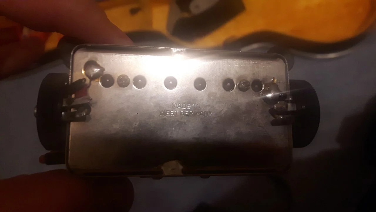 ich habe von einem Freund eine alte Aria-E-Gitarre zum Geburtstag bekommen. Specs: Aria Cardinal Series CS-250 Model, SG-Style, Vollmassiv, Mahagonikorpus mit Bolt-on Ahron Neck, 22 Bünde, Palisander-Griffbrett, 2 DiMarzio Pickups (NICHT die Originale), 2 Volumen & 2 Tonregler, 3-Wege-Schalter, Coil-Split-Schalter, Out-of-Phase-Schalter, Plektrenhalter. Mit dabei: Ein Stimmgerät (Korg GS-2) mit Rechnung von 1992, ein Kabel, ein Gurt, ein Kapo, ein Imbusschlüssel und ein Koffer. Doch ich nehme an, das diese Gitarre vor dem Mauerfall gefertigt wurde, da etwas dabei ist, auf dem "Made in West Germany" steht, und zu dem ich einige Fragen habe: