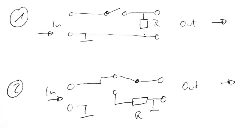 Beide haben Vor- und Nachteile: Bei Variante 1 hängt der Widerstand die ganze Zeit im Signalweg und kann potentiell den Klang verändern (vernachlässigbar, wenn groß genug, also ca. 1MOhm) - dafür ist diese Variante die tendentiell "knackfreiere" von beiden. Variante 2 schließt den Ausgang (des Schalters, also Eingang des Amps) nur kurz, wenn stummgeschaltet ist - das kann dann aber gerne schonmal knacken.
