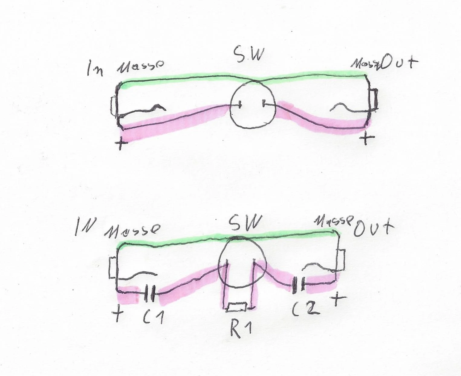 Dann zum Thema Kurzschluss: Wie ich schon sagte, sollte man einen Ausgang eines Geräts nicht kurzschließen - passive Tonquellen wie Pickups oder dynamische Mikros vertragen das (so sind z.B. die in manchen dynamischen Mikros eingebauten Stummschalter typischerweise aufgebaut. In deinem Fall bzw. wenn der Schalter universell einsetzbar sein soll, dann schließt man nur den Eingang des nachfolgenden Geräts (hier also FX Return) kurz. Das wiederum ist völlig unproblematisch, weil das genau einem Signal entspricht, bei dem