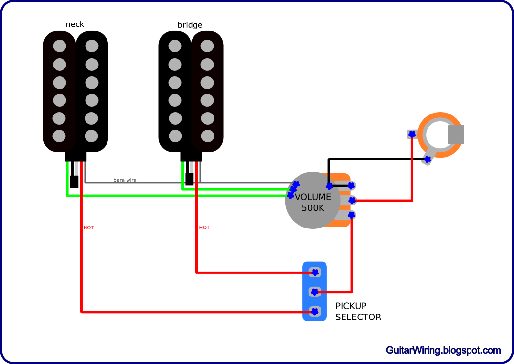 Über einen Toggle Switch mit 3 Positionen soll entweder der Bridge Humbucker, der Neck Humbucker oder aber beide zusammen betrieben werden.