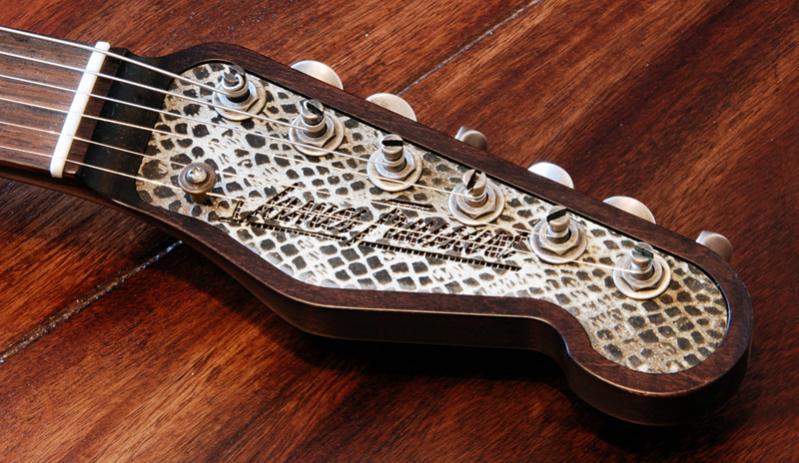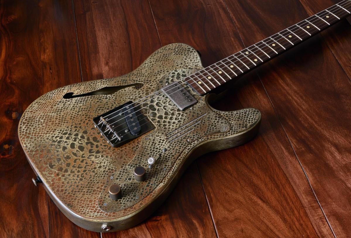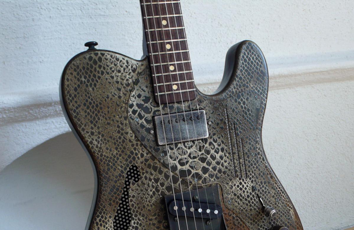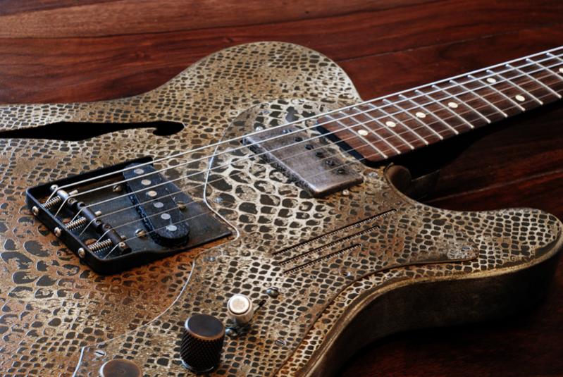 Danke, Christian hat es schon ganz richtig erraten, die zweite von hinten ist eine James Trussart Steelcaster Deluxe, der Korpus ist quasi wie ein Thinline Model aus rostigem Stahl und hat ein Schlangenhautmuster eingearbeitet