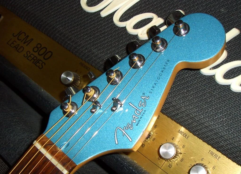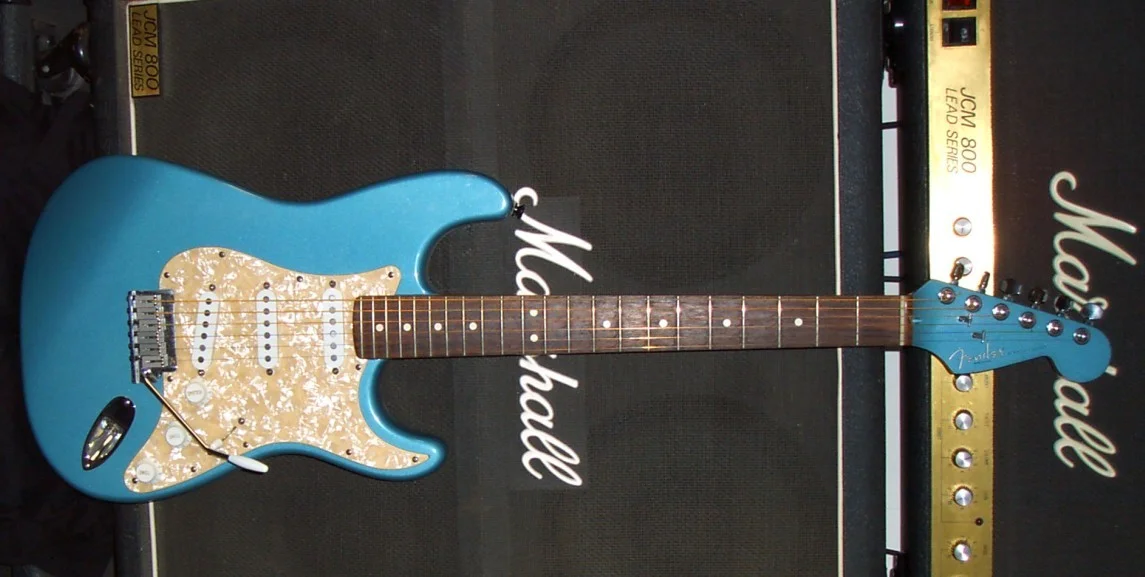 Fender Strat matching Headstock 95ér limited edition in der seltensten Farbe (ocean tourquise), witzigerweise Maxima Gold Strings aufgezogen, die habe ich seit 20 Jahren nicht mehr gesehen…^^