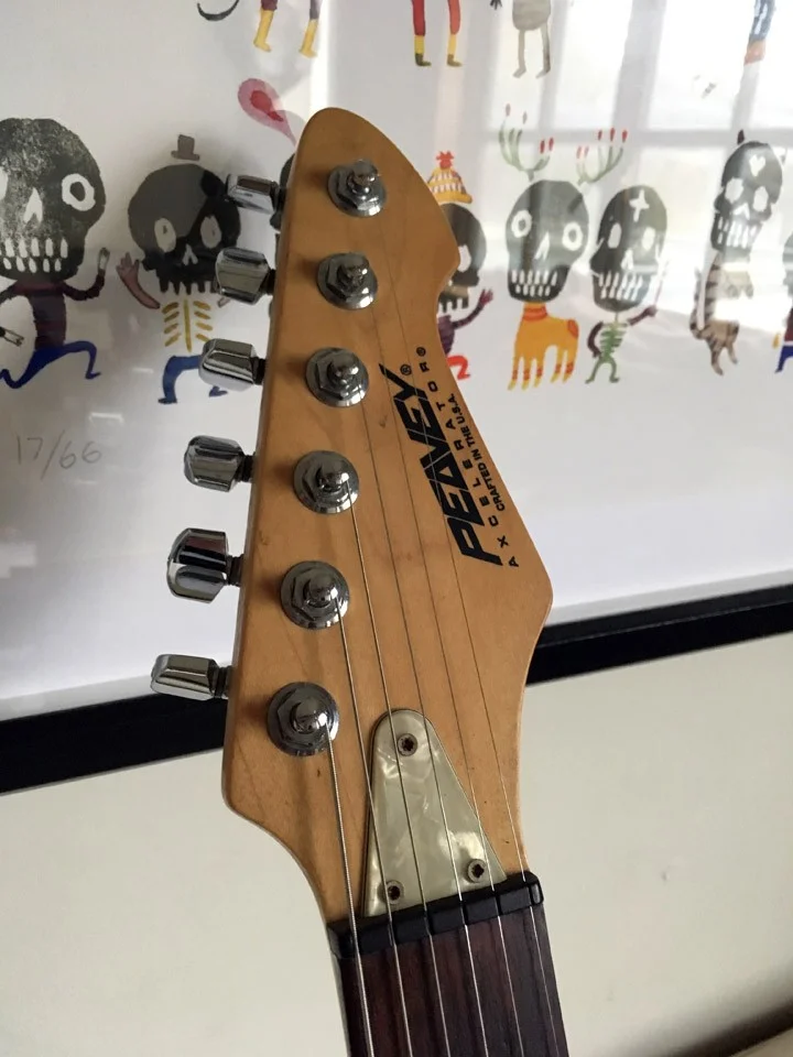 Made in USA Peavey Axcelerator ... eine sehr, sehr moderne Gitarre aus den 90s ... hauchduenner Hals (da muss ich mich schon sehr dran gewoehnen!), super flacher Griffbrettradius, alles original (Locking Tuner, Graphit-Reiter, Blade-Pickups, etc.). Macht tierisch Laune. Und vor allen Dingen sind diese Teil unverschaemt guenstig! Kann kaum glauben, dass ich eine Made in USA Gitarre fuer unter $300 bekommen kann. Abgefahren ...