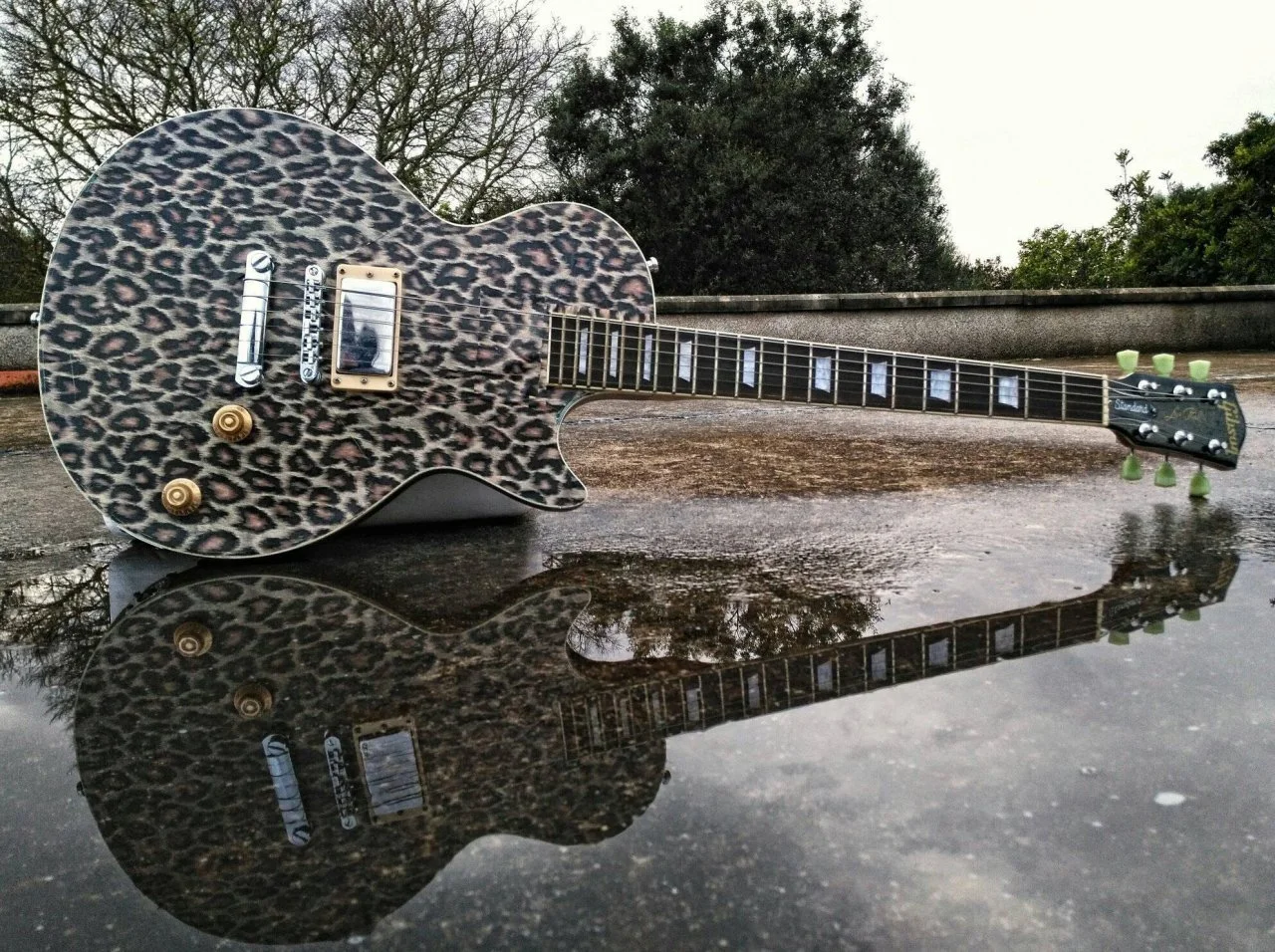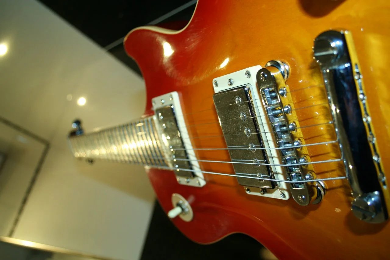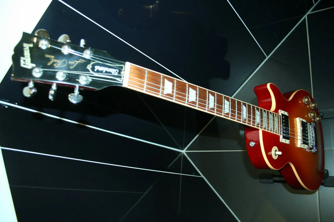 Die Les Paul ist ein Bausatz von ML-Factory. Habe damals viel für das Nitrolack-Finish ausgegeben, es hat mich aber nie so richtig überzeugt. Da wir jetzt so eine Art 80s-Poser-Glamrock Band gründen, habe ich einfach Vinyl-Folie drübergeklebt und nur den Bridge PU mit den dazugehörigen Potis gelassen.das is ja ein abgefahrenes Teil, kannst du dazu bisschen was erzählen?
